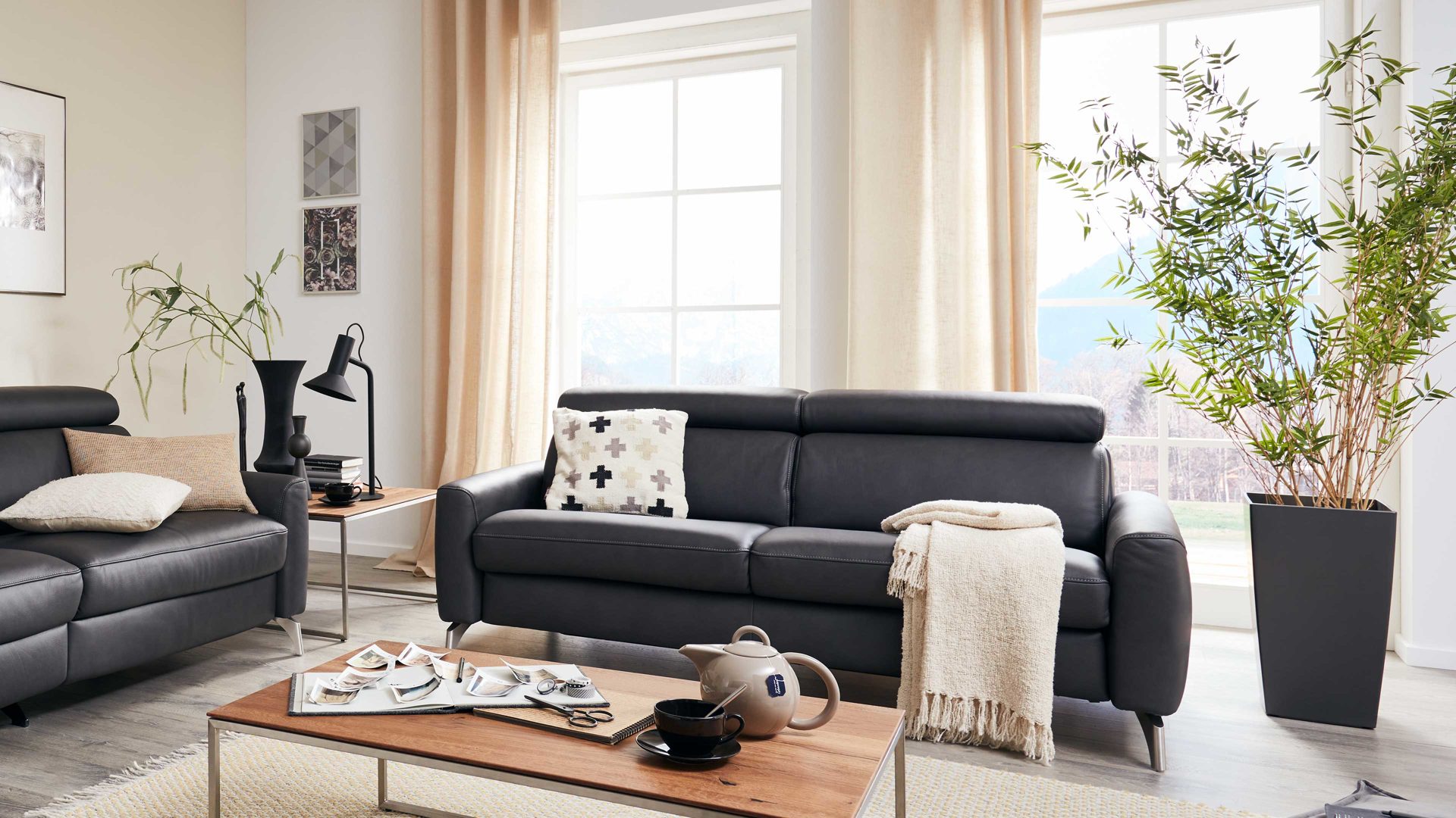 kohlefarbener LongLife-Lederbezug und edelstahlfarbene gebürstete Metallfüße