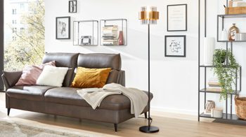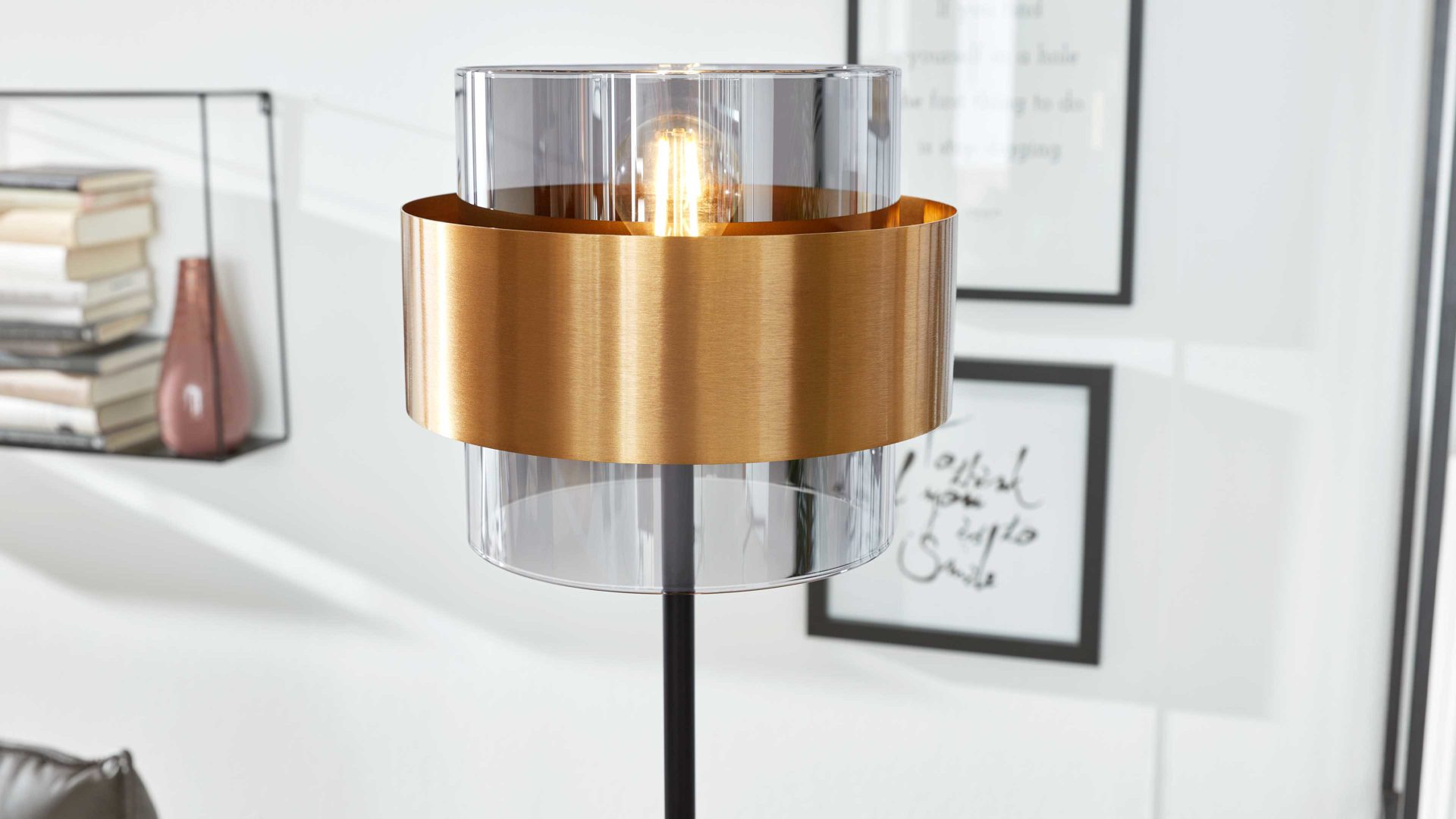 Die Stehleuchte aus der Interliving Leuchten Serie 9333 vereint modernes Design mit raffinierten Details und bringt stilvolle Atmosphäre in dein Zuhause. Das schlanke Gestell aus klassisch mattschwarzem Metall trifft auf einen rauchfarbenen Glasschirm, der von einem gebürsteten messingfarbenen Metallring eingefasst ist. Dieses edle Zusammenspiel aus Materialien und Farben verleiht der Lampe ihren charaktervollen Look – perfekt für Wohn-, Schlaf- oder Arbeitszimmer.