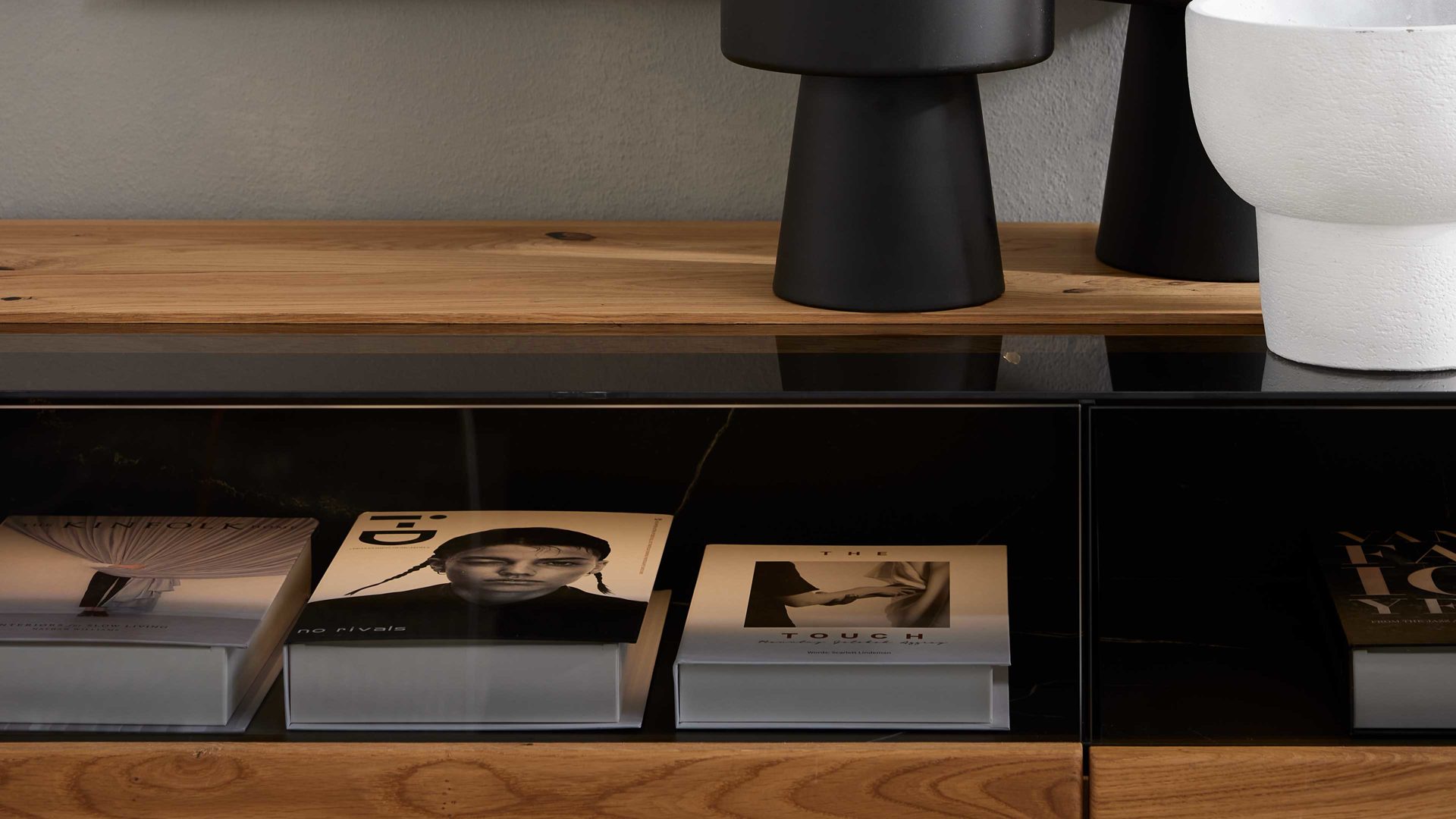 Streifenbeleuchtung für Sideboard und Wandregal aus der Interliving Wohnzimmer Serie 2027 – stilvolle Rückwandbeleuchtung mit warmweißem LED-Licht