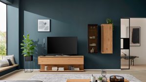 Die kontrastreiche Kombination von dunkler und heller Asteiche schafft optische Tiefe und verleiht deinem Wohnzimmer eine natürliche, lebendige Atmosphäre. Beide Oberflächen betonen die individuelle Maserung des Holzes und sorgen für ein warmes, wohnliches Ambiente.