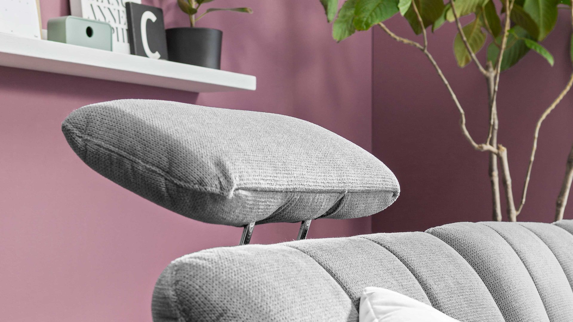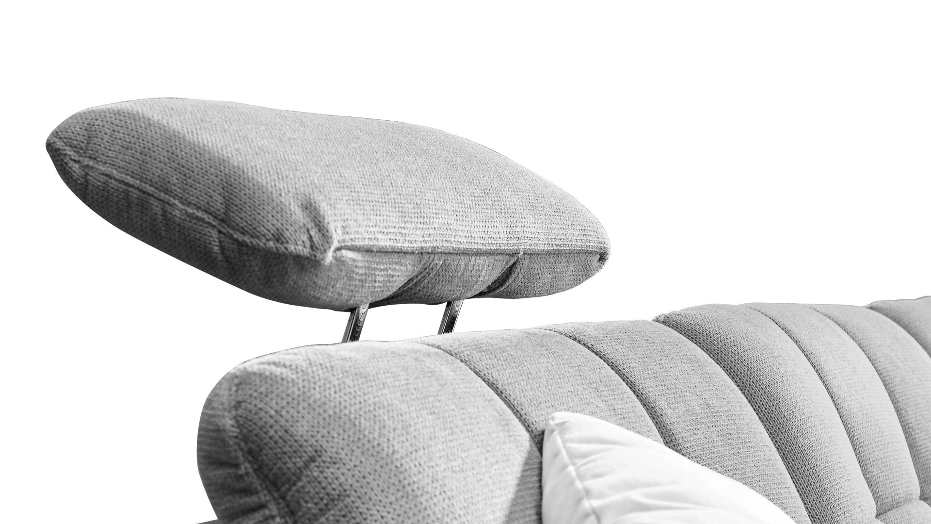 Die Comfort-Kopfstütze CKS mit dem stahlfarbenen Mikro-Cenillebezug und Maßen von ca. 44 x 32 x 10 cm (BxHxT) ist ein Mehrpreis-Zubehör für die Sofas des Modells Modulmaster MM-MP1143, die gleich bezogen sind. Mittels Rasterbeschlag lässt sich die Stütze auf der Vorrichtung aus verchromtem Metall mehrfach verstellen und dadurch stets in die gewünschte Position bringen, um Kopf und Nacken zu stabilisieren oder zu entspannen.