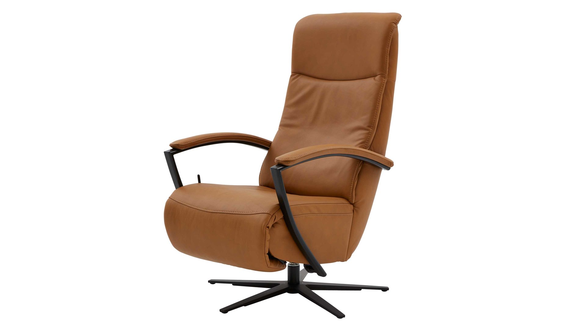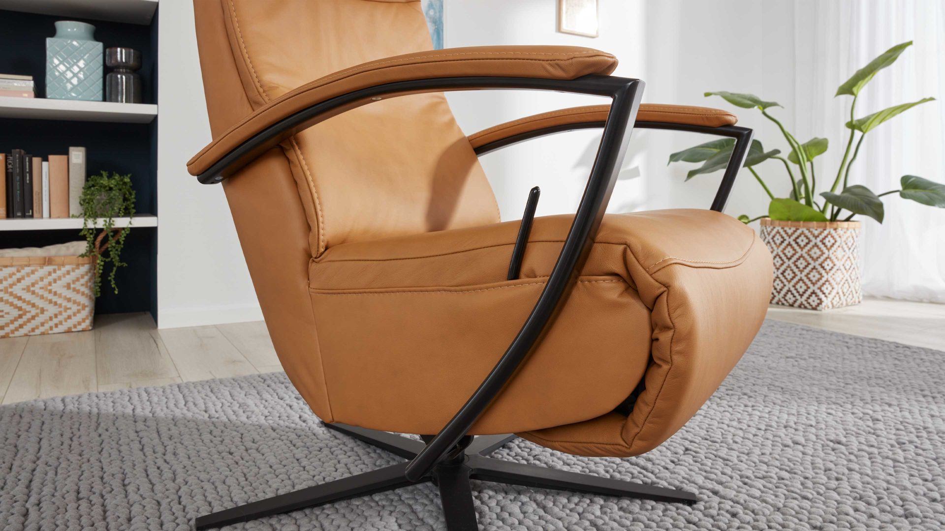 Dank der hochwertigen Polyätherschaumpolsterung auf einer Wellenunterfederung, der ergonomischen Rückenlehne C, den schwarzen Metall-Armlehnen 5 mit Polsterauflage und der angenehmen Haptik des feinen Leders genießen Sie auf dem Fernsehsessel hohen Sitzkomfort.
