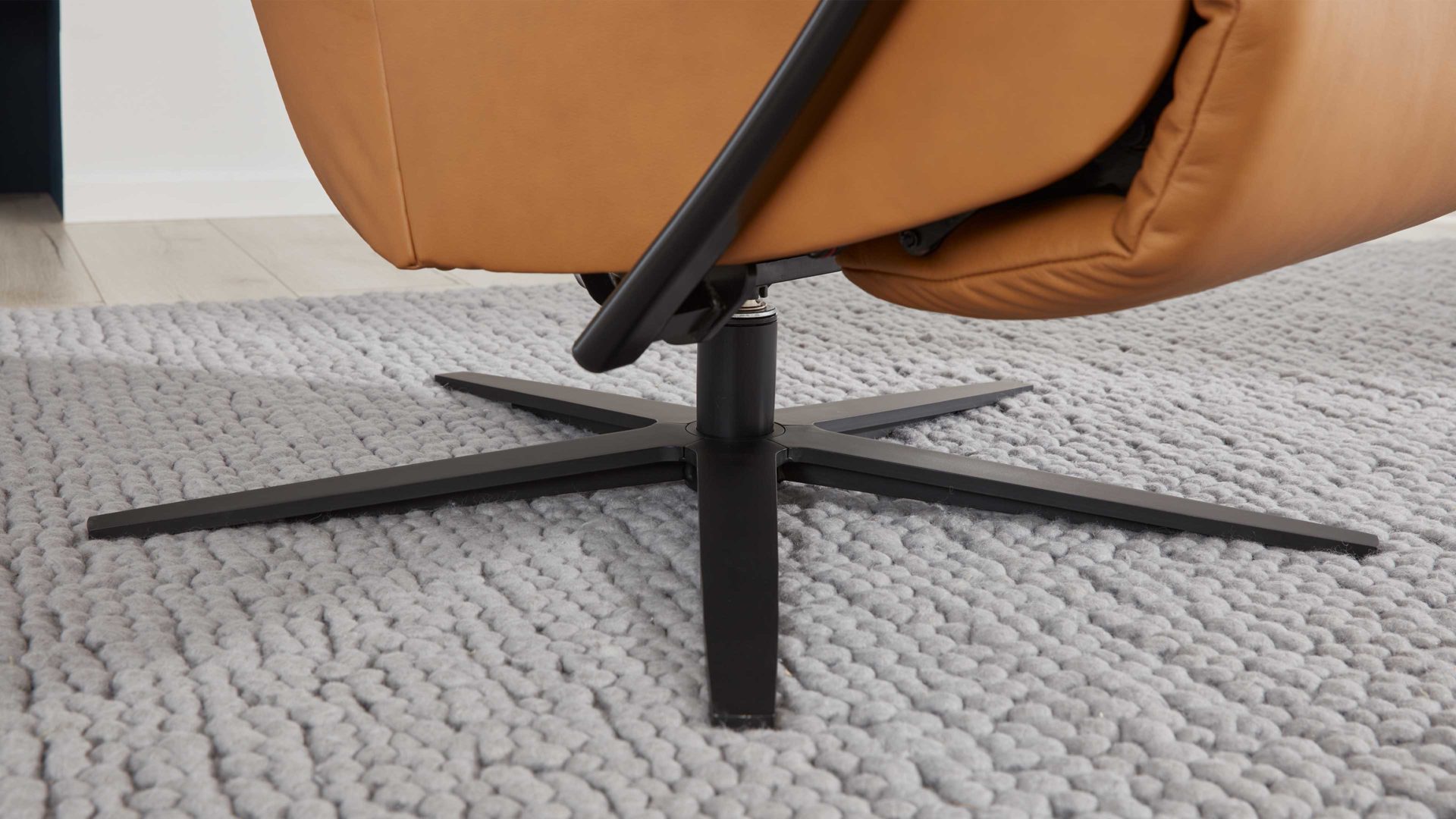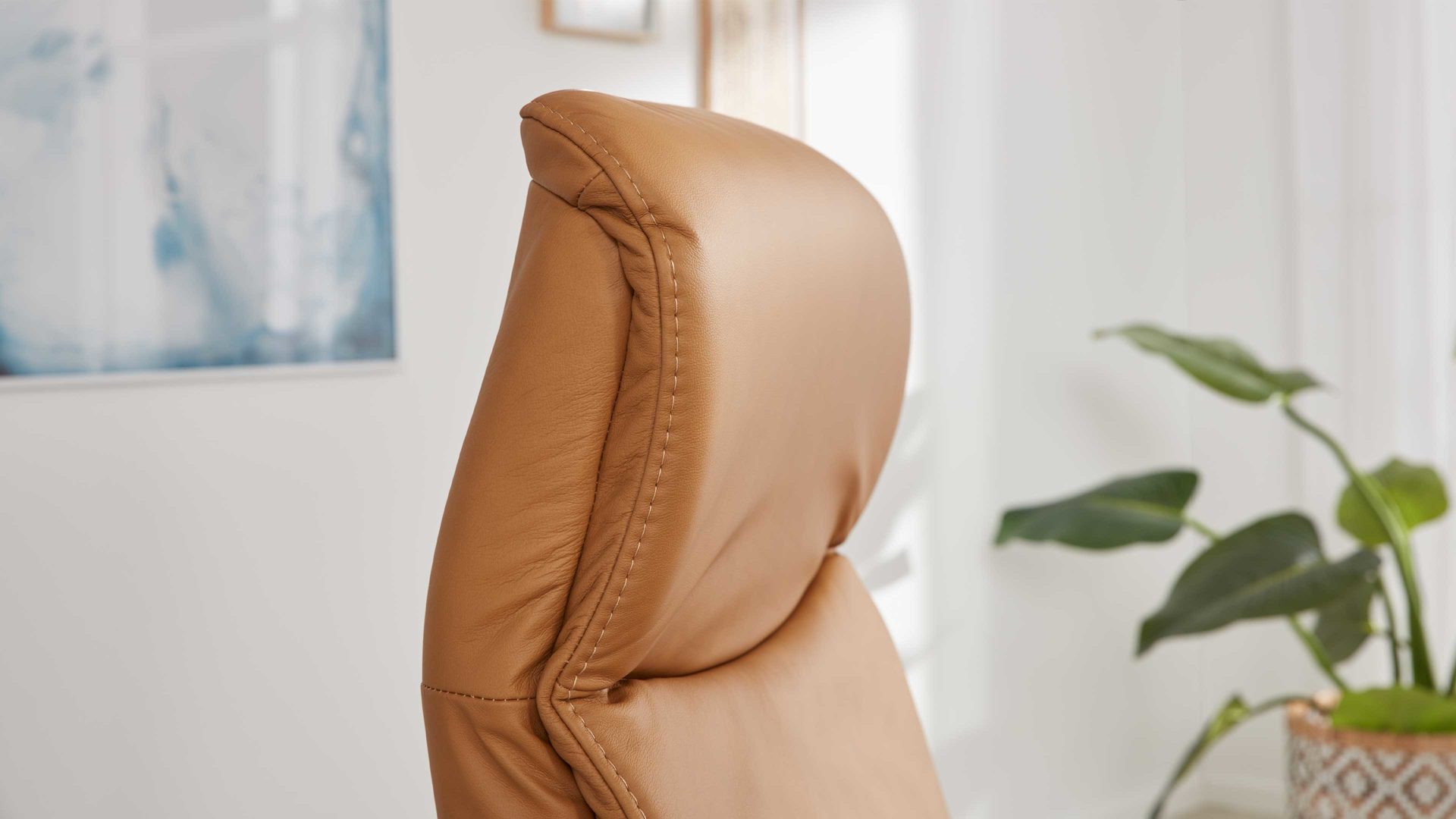 Mit dem kurkumafarben pigmentierten Glattlederbezug samt Ton-in-Ton-Kappnaht strahlt er moderne Eleganz aus. Für hohe Standfestigkeit sorgt der mattschwarze Metall-Sternfuß AD4S, der die Optik zudem harmonisch abrundet.