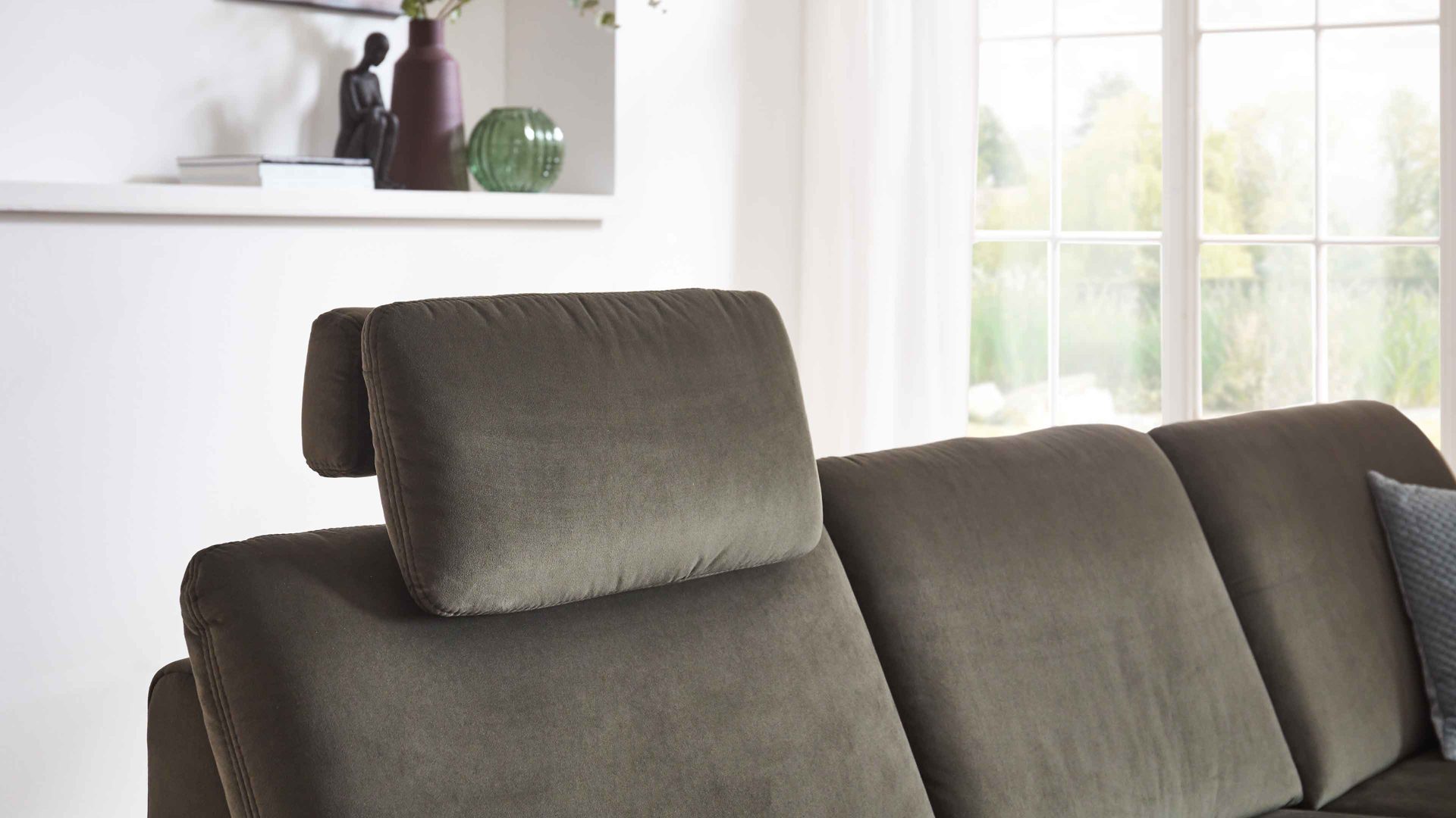 Die Premium-Kopfstütze PKSG ist ein Mehrpreis-Zubehör für die Polstermöbel aus der Modulmaster-Serie MM-ZE1156. Mit dem olivgrünen Stoffbezug in Samtoptik und der Kopfstützen-Vorrichtung aus verchromtem Metall präsentiert sie sich modern-elegant designt.