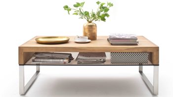 Der Couchtisch Hilary überrascht mit seinem außergewöhnlichen Design, das warme und kühle Eigenschaften auf moderne und stilvolle Art miteinander verbindet. Während die edelstahlfarbenen Kufenfüße aus robustem Metall schlichten und funktionalen Charakter haben, bringt die Tischplatte in Asteiche natürlichen Charme mit. Optisch akzentuierend und zudem sehr praktisch ist der Ablageboden aus bronzefarbenem Sicherheitsglas.