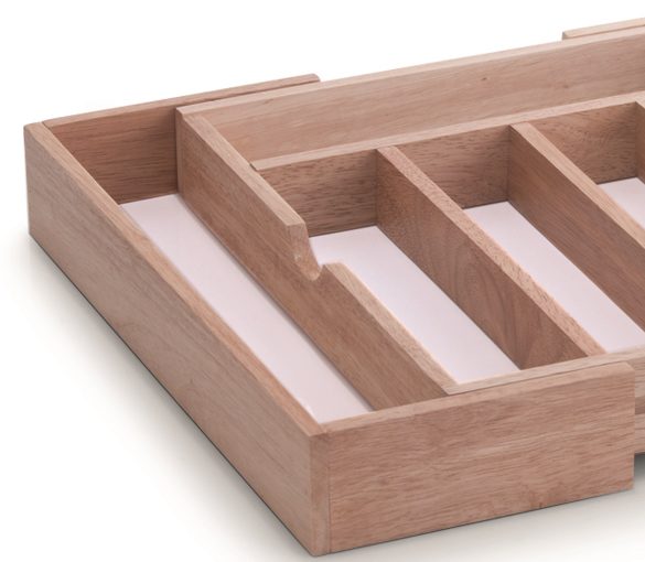 Das Highlight des Schubladeneinsatzes: Der Besteckkasten passt sich vielen Schubladengrößen an, denn er verfügt über eine variable Breite von ca. 32 bis 50 cm. Somit befüllen Sie Ihre Schubladen passgenau oder lassen Platz für andere Gegenstände. Legen Sie sowohl Ihre Bestecksets als auch Suppenlöffel, Küchenmesser oder auch Ihr Vorlegebesteck in den Besteckkasteneinsatz. Der Besteckkasten ist für handelsübliche Schubladen geeignet.