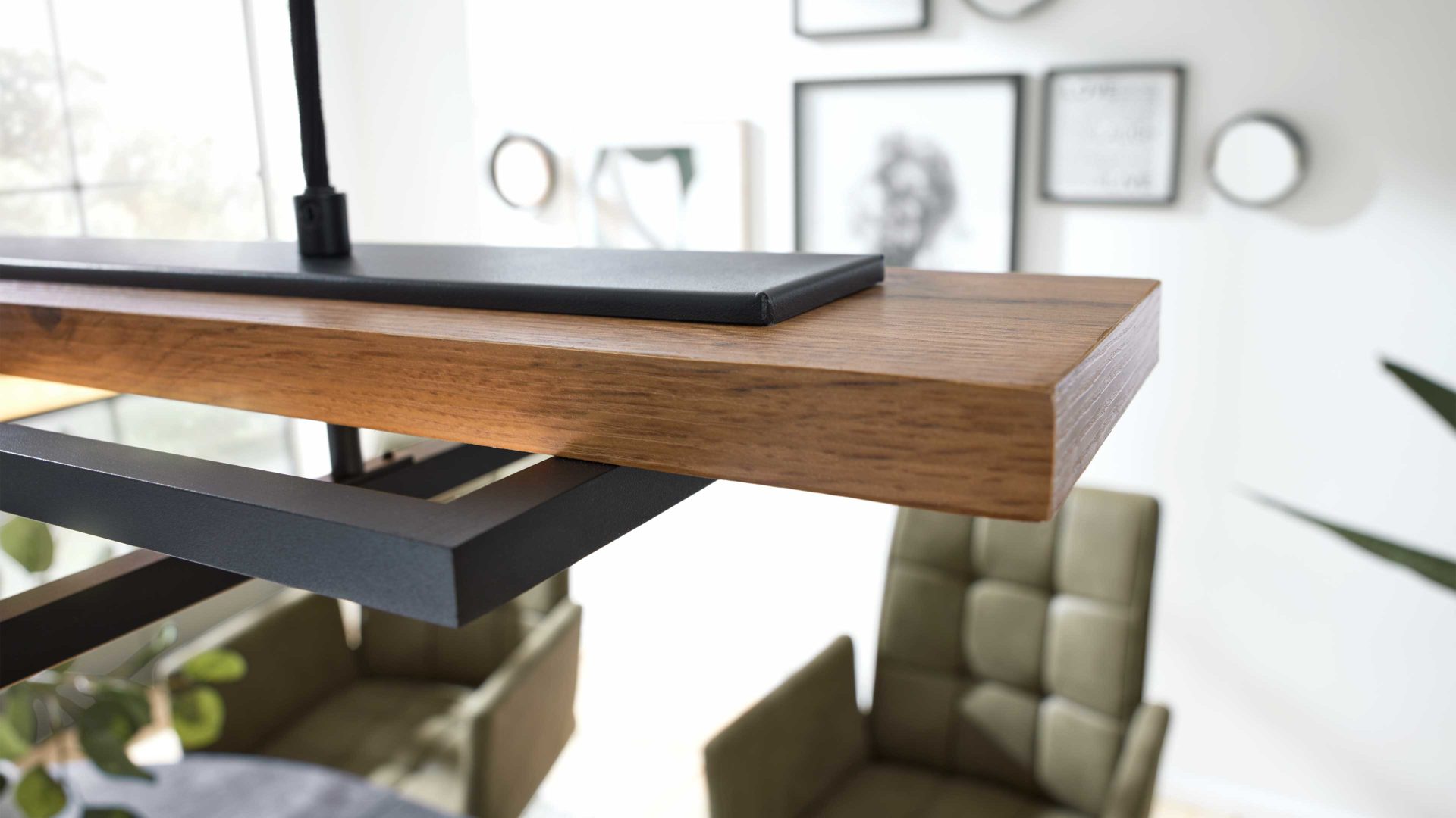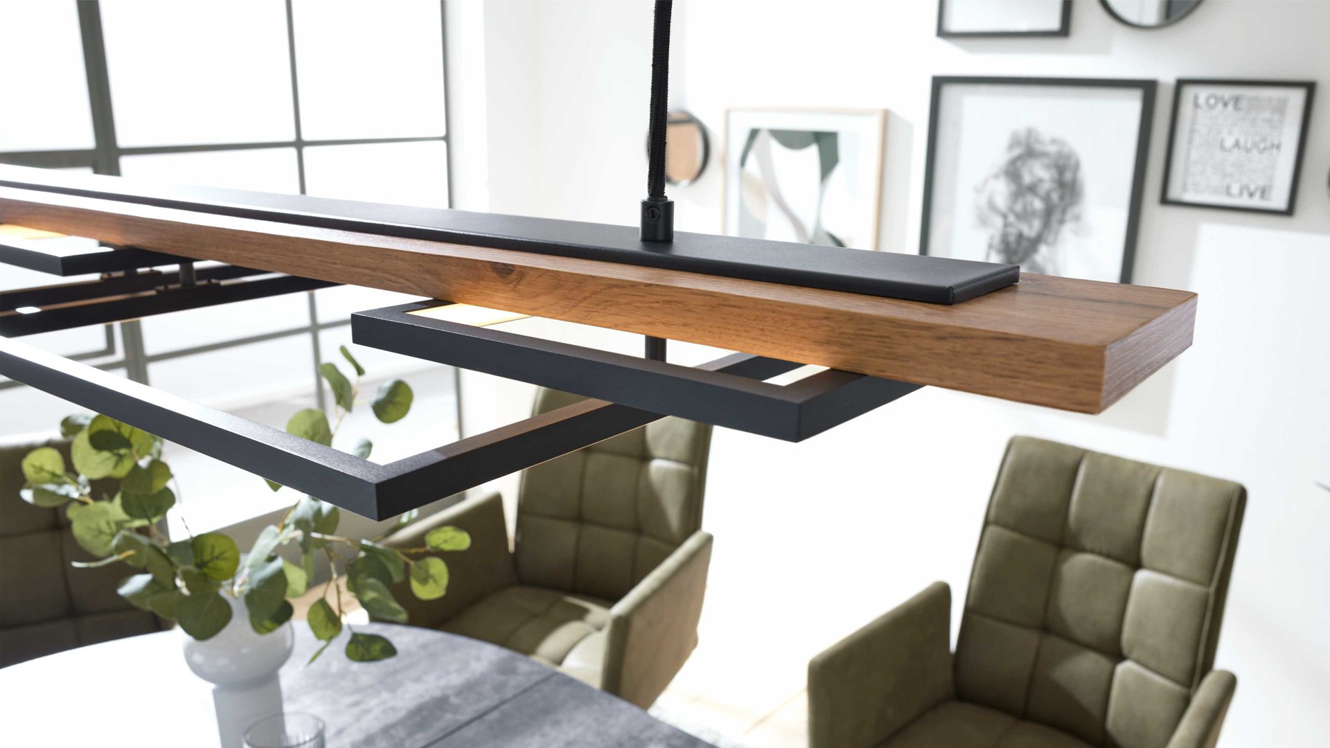 Die Pendelleuchte aus der Interliving Leuchten Serie 9342 überzeugt durch ihre stilvolle Kombination aus dunkler Holznachbildung (MDF), mattschwarzem Aluminium, opalweißem Kunststoff und einem schwarzen Textilkabel. Ihr klares, geometrisches Design verleiht ihr eine moderne, architektonische Note und macht sie zur perfekten Lichtquelle über Esstischen oder in offenen Wohnbereichen.