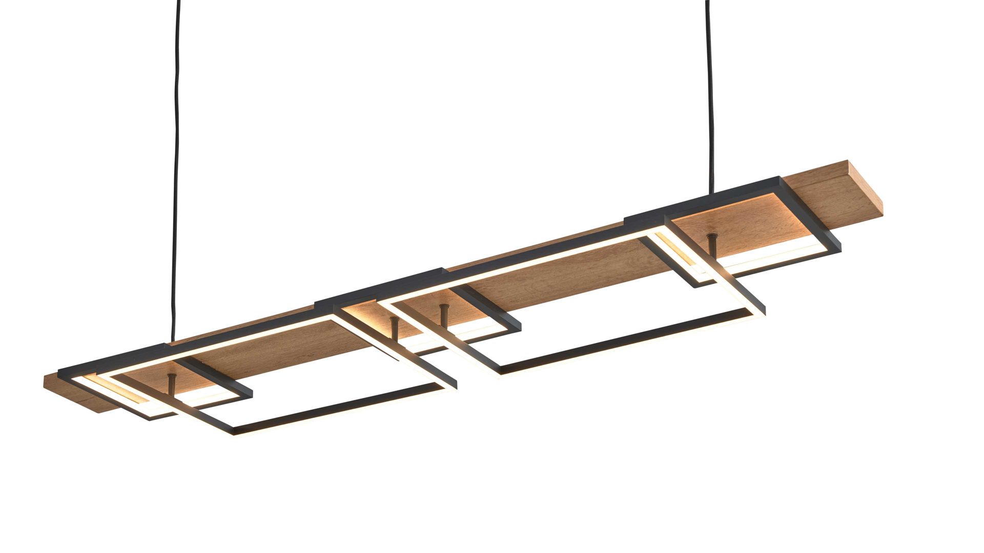 Die markante Formgebung aus zwei Rechtecken mit ca. 30 x 40 cm (B/L) und zwei Quadraten mit je ca. 20 x 20 cm (B/L) betont das moderne, strukturierte Erscheinungsbild. Mit ihren Gesamtmaßen von ca. 125 x 9 x 30 cm (B/L x H x T) und einem ca. 120 cm langen Kabel lässt sich die Leuchte individuell in der Höhe anpassen – ideal für Essbereiche, Wohnzimmer oder offene Raumkonzepte.