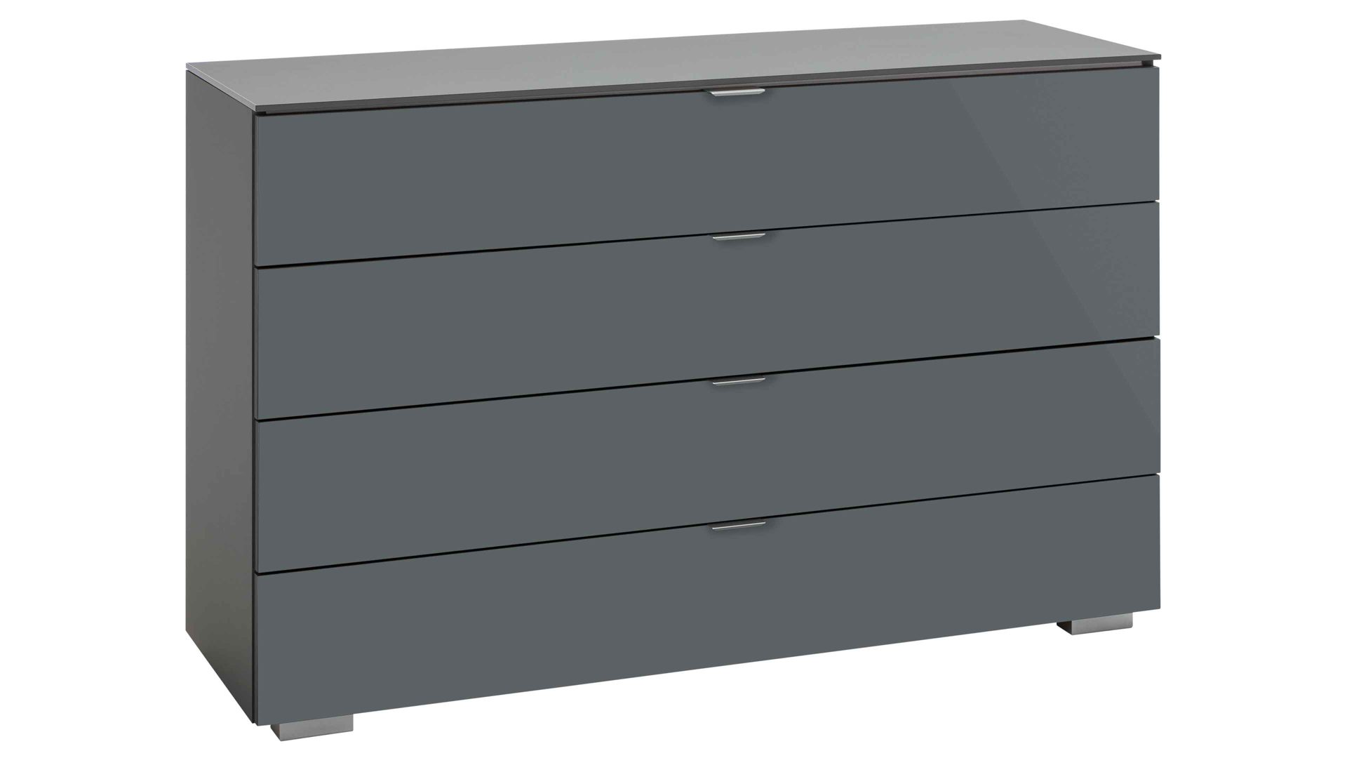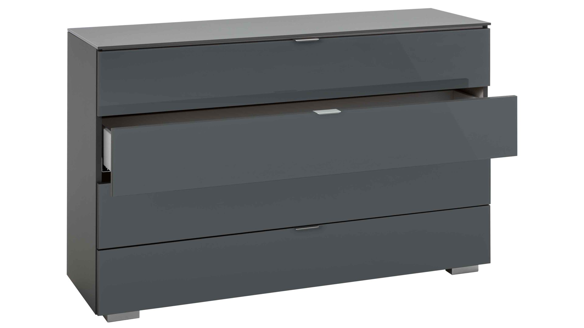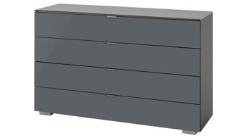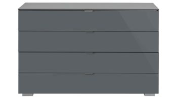 Glänzende vulkanfarbene Glasfronten verleihen der STAUD Schubladenkommode Ancona eine modern-elegante Ausstrahlung mit futuristischem Charme. Aluminiumfarbene Griffe und Füße runden das spezielle Design stilsicher ab.