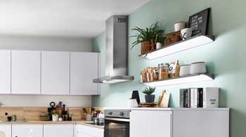 In den vielen Schrankelementen und Auszügen können Sie Geschirr, Besteck und sonstige Küchenutensilien aufbewahren sowie Lebensmittel lagern. Die zwei beleuchteten Wandregale mit fest verbauten LED-Leuchtmitteln der Energieeffizienzklasse G (Spektrum A bis G) sind jeweils ca. 90 cm lang und bieten auch Platz für Dekoratives.