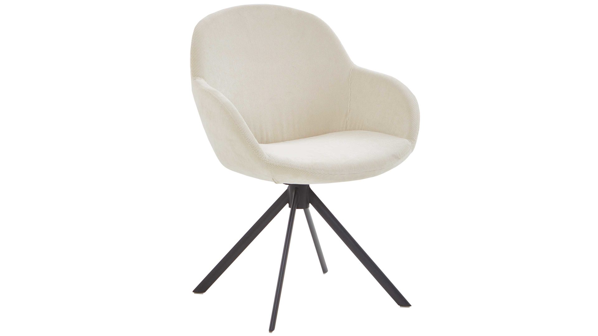 Der hochwertige NIEHOFF Armlehnstuhl Dacapo verkörpert moderne Eleganz und Gemütlichkeit. Mit dem mattschwarz lackierten Stativgestell aus robustem Eisen sowie dem trendigen cremefarbenen Cordbezug überzeugt er sowohl optisch als auch qualitativ. Dank der Ergo-Schale mit Formschaum bietet der Designerstuhl für das Esszimmer extra hohen Sitzkomfort.