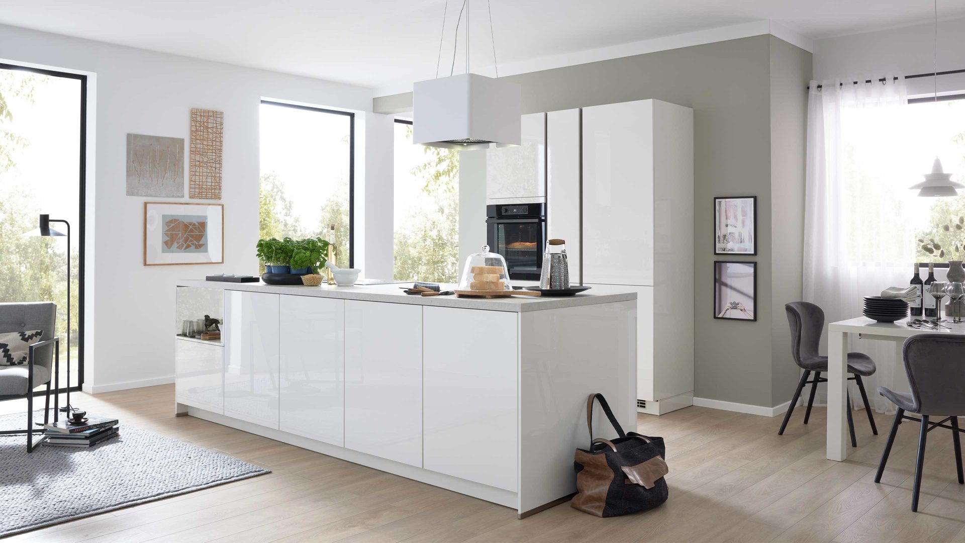 Für frische Luft beim Kochen sorgt der leistungsstarke Airforce Dunstabzug F181WH, der mit der Energieeffizienzklasse B (Spektrum A++ bis E) ausgezeichnet ist. Sein elegantes Design fügt sich nahtlos in das helle, moderne Gesamtbild der Küche ein.