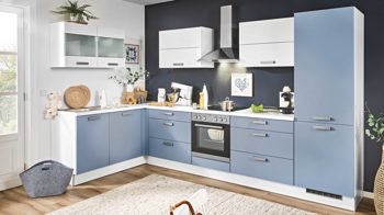 Markanter Landhausstil in Steinblau - nobilia® Einbauküche Frame mit Geräten und Ansetztisch