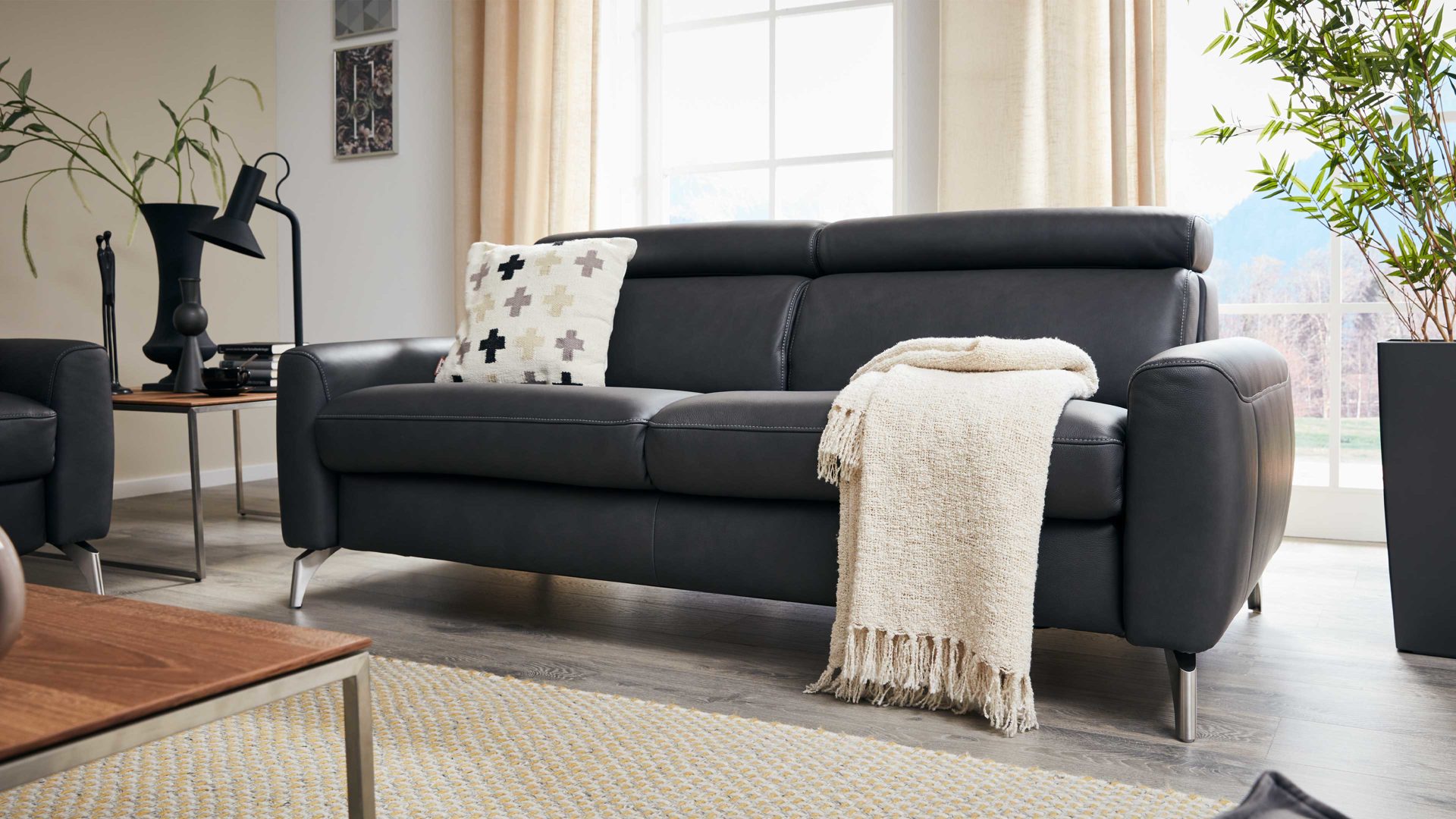 kohlefarbener LongLife-Lederbezug und edelstahlfarbene gebürstete Metallfüße