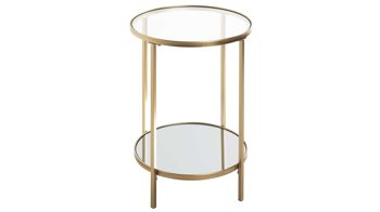 Der Beistelltisch ist mit seinem modernen und eleganten Design ein absoluter Hingucker. Er kombiniert ein goldfarben lackiertes Metallgestell mit zwei Ablagen: Die obere besteht aus Sicherheitsglas und die untere aus Spiegelglas. Dank der hochwertigen Materialien ist das Tischchen robust, widerstandsfähig und langlebig. Seine Maße belaufen sich auf ca. 55 x 39 cm (HxD).