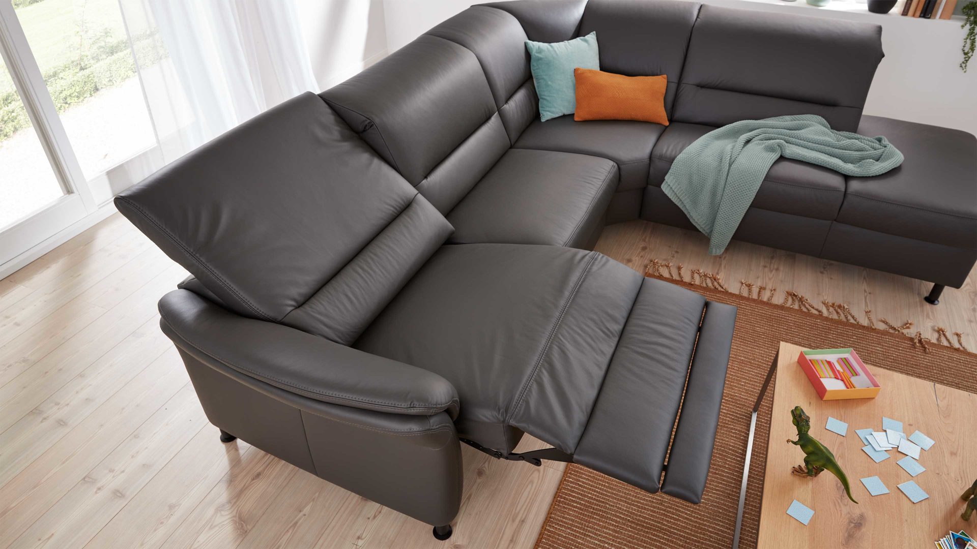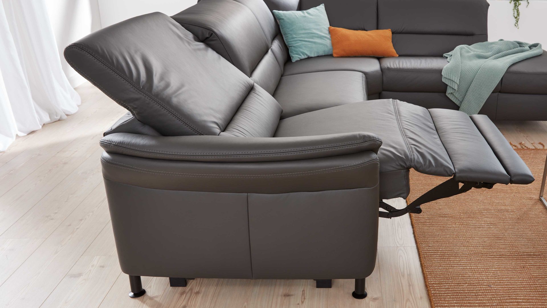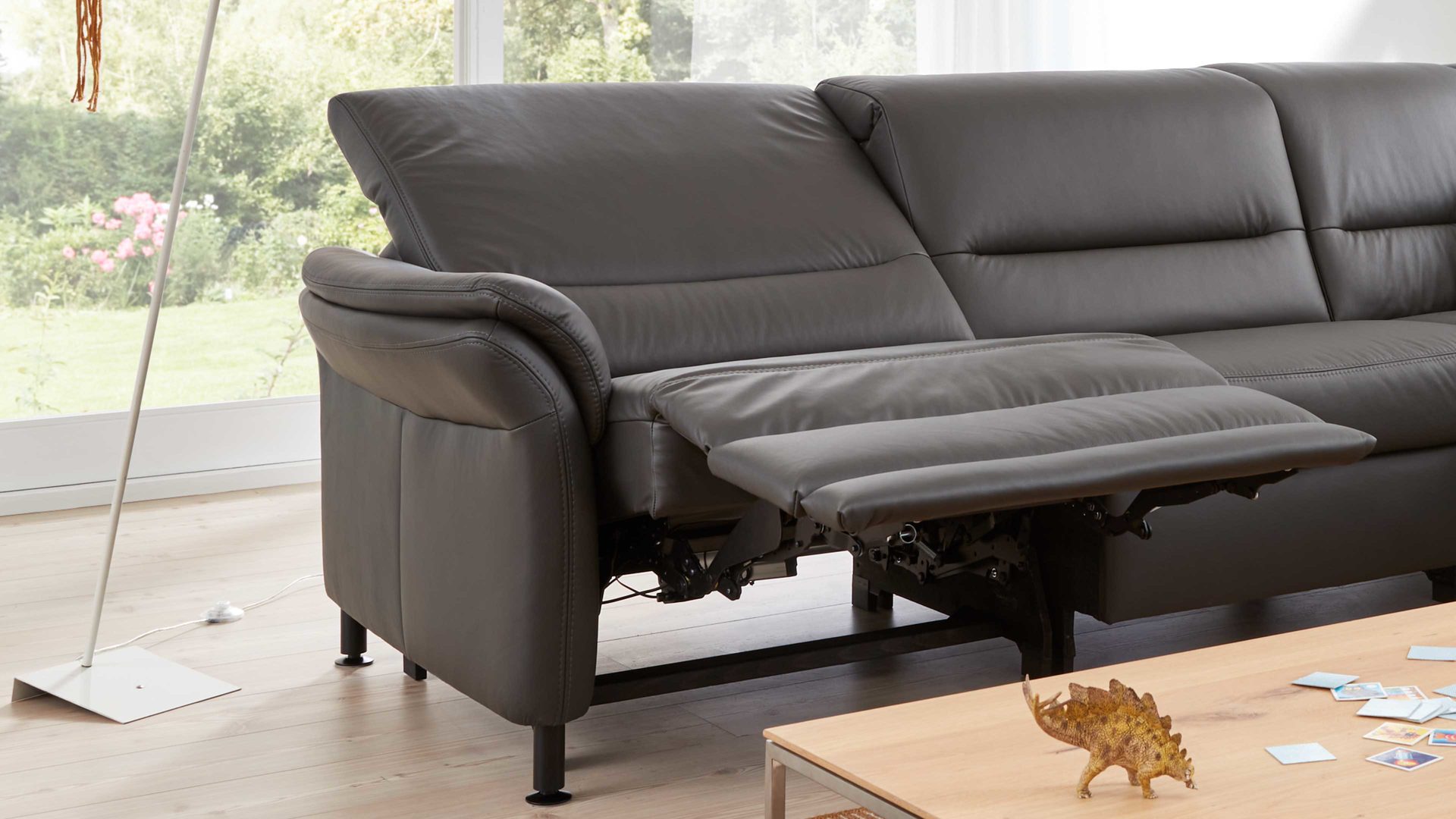 1. Zuerst fährt die Beinauflage auf Sitzhöhe. Parallel dazu bewegt sich auch der Sitz einige Zentimeter nach oben und nach vorne in eine Relaxposition. Der Rücken der Couch bleibt hierbei wandfrei.