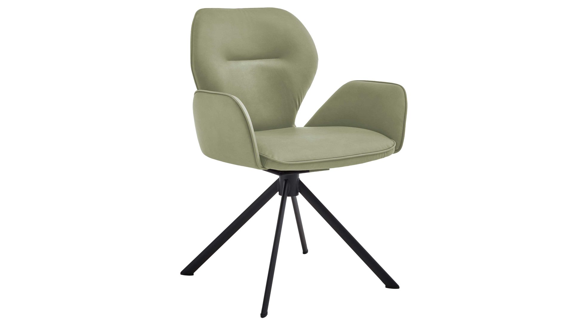 Er kombiniert ein mattschwarz lackiertes Stativgestell aus robustem Eisen mit einem lindgrünen Mikrofaserbezug in Lederoptik und fügt sich in verschiedene Wohnstile harmonisch ein. Zu den optischen Highlights des Esszimmerstuhls gehört neben der Formensprache und den perfekt aufeinander abgestimmten Farben der markante Quereinzug im Rücken. Praktisch begeistern die Drehbarkeit um 180 Grad mit Rückholfunktion sowie die bodenschonenden Gleiter am Gestell.