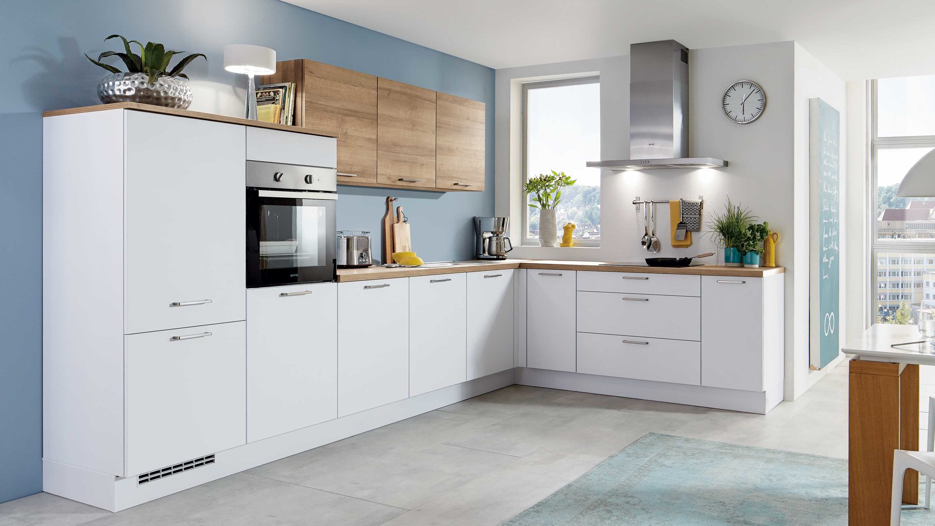 Die Stellfläche beziehungsweise das Schenkelmaß der L-Küchenzeile beläuft sich auf ca. 325 x 325 cm (BxL, von links nach rechts). Dank der vielen Schränke mit Türen, Schubkästen und offenen Regalbereichen bietet die Planküche reichlich Stauraum für Geschirr und Besteck, Lebensmittel sowie verschiedene Küchenutensilien und -accessoires.
