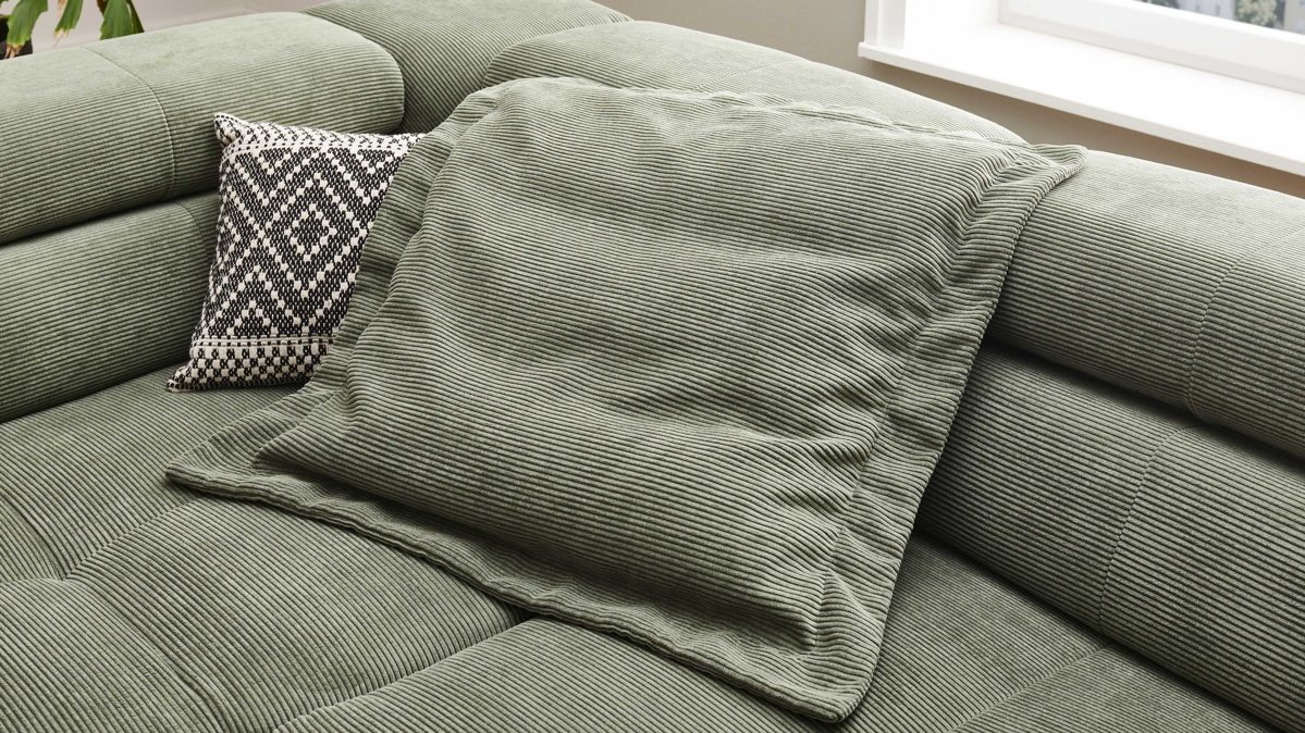 Das Flatterkissen aus der SOFAkultur Serie SK 745 2.0 präsentiert sich modern-elegant designt mit olivgrünem Feincordbezug.