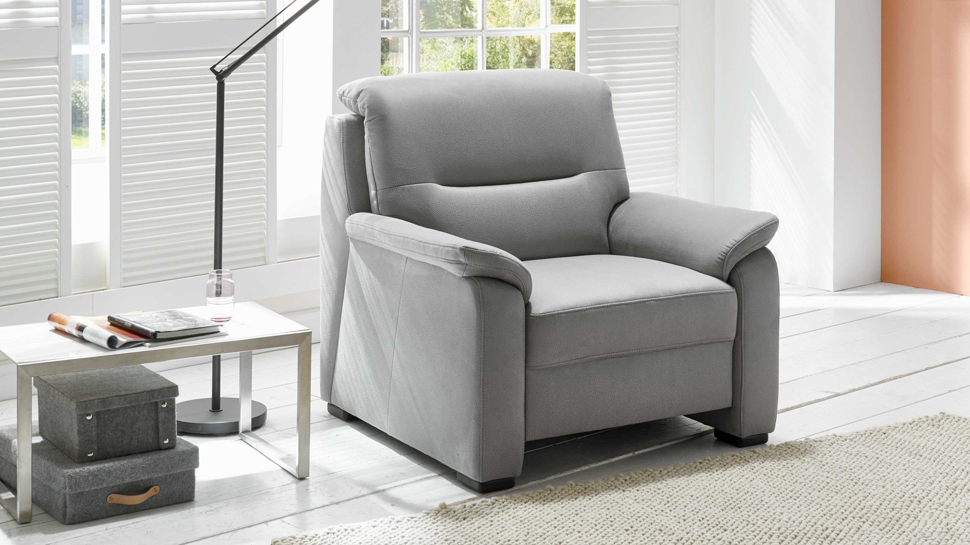 • Die Abbildung zeigt ein Wohnbeispiel, welches auch Dekoration sowie separat erhältliches Zubehör enthält. Im Lieferumfang enthalten ist der Sessel.