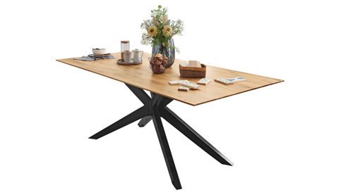 Der NIEHOFF Massivholz-Esstisch Cloudy zeichnet sich durch hohe Qualität sowie moderne Designmerkmale aus. Er kombiniert ein markantes, klassisch mattschwarz lackiertes Sterngestell aus robustem Eisen mit einer Massivholzplatte aus Charakter-Eiche und fügt sich in verschiedene Wohnstile harmonisch ein.