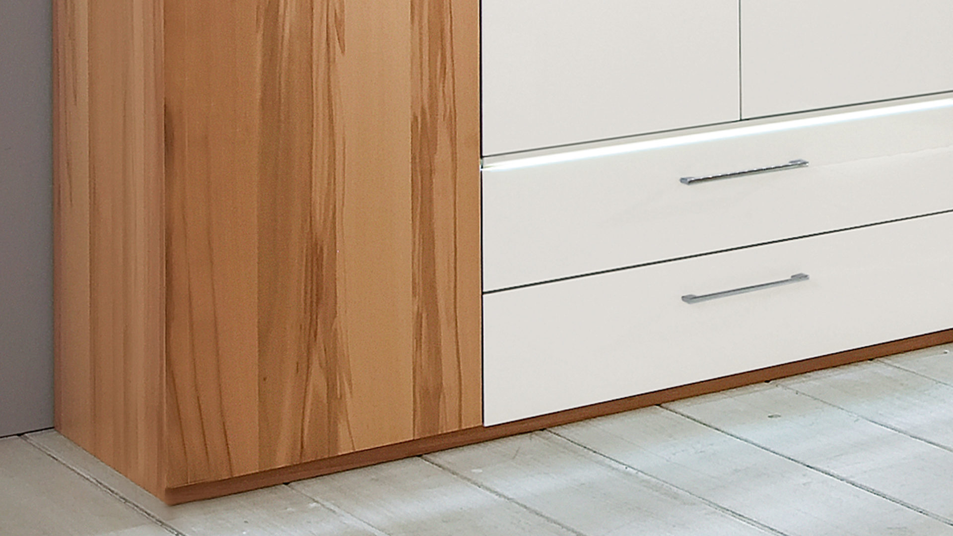 Auch funktional überzeugt der Kombischrank vollkommen. Er umfasst vier Türen, von denen zwei im Holz- und zwei im Hochglanz-Look erscheinen. Alle Türen sind mit Bürstendichtung und Türdämpfer ausgestattet. Dahinter bieten Ihnen insgesamt vier Einlegeböden und zwei Kleiderstangen Möglichkeiten, Ihre Kleidung, Bettwäsche und sonstigen Textilien unterzubringen. Des Weiteren verfügt das Schlafzimmermöbel über zwei Schubladen mit praktischem Selbsteinzug. Sie eröffnen Ihnen weitere Stauraumoptionen, beispielsweise für Ihre Unterwäsche und Socken.