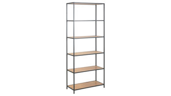 Es besteht aus railwaybraunem Eichenholzfurnier sowie pulverbeschichtetem Metall in der Farbe Schwarz. Drei stabile Holzböden halten ausreichend Stauraum für Bücher, Blumentöpfe oder Dekoaccessoires bereit.