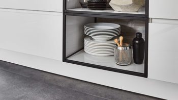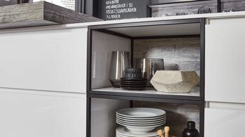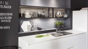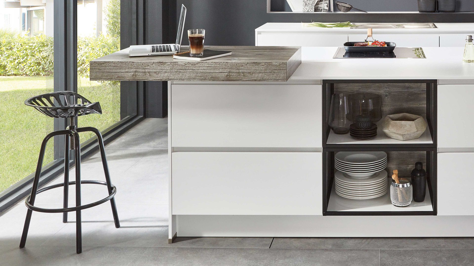 Mit alpinweißen Lackfronten, einem Ponderosa pinienfarbenen Regal und Ansatztisch fügt sich die Planküche hervorragend in viele Wohnkonzept ein.