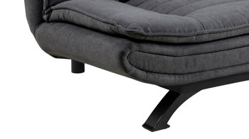 Dieses edle Schlafsofa mit weichem dunkelgrauen Stoffbezug und mattschwarz pulverbeschichteten Füßen lädt direkt zum Ausruhen, Schlafen und Träumen ein. Ungewöhnlich ist die futuristisch anmutende Form, die sehr reduziert und klar wirkt. Für Bequemlichkeit sorgen die üppigen Polster mit Steppnähten an Sitz- und Rückenfläche. Das Bettsofa bietet Sitzplatz für zwei Personen.