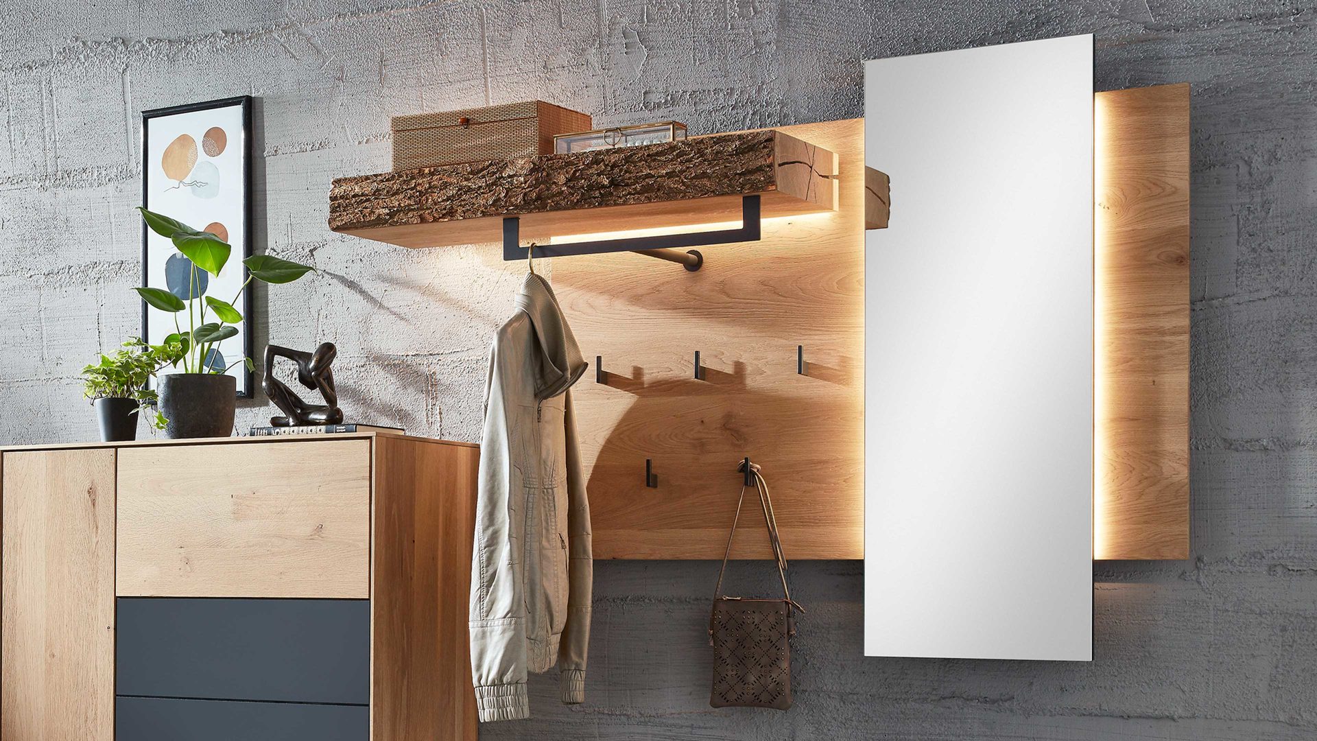 Die Wandgarderobe Runa verbindet massive Kerneiche, Rindenholz, hochwertiges Spiegelglas und anthrazitfarbenes Metall zu einem robusten, modernen und eindrucksvollen Ganzen.