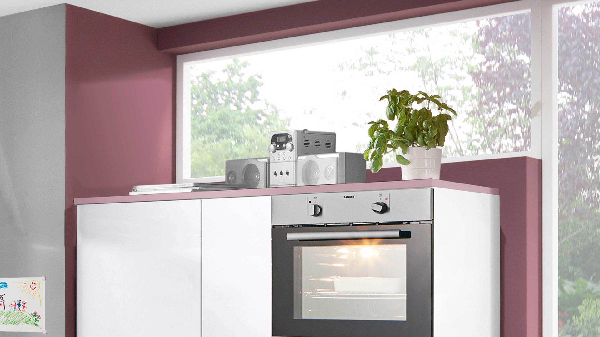 Puristisch weiß präsentieren sich auch die Korpusseiten und Sockelblenden, während der Oberboden des Hochschrankelements wiederum edel antikrosa daherkommt. Einen gelungenen Akzent setzt die Arbeitsplatte in graubrauner Granit-Nachbildung. Schwarze Bügelgriffe runden die modern-elegante Optik stimmig ab.