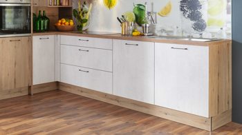 Die EXPRESS KÜCHEN Einbauküche Plan mit privileg Geräten kombiniert den natürlich-warmen Charme astiger Eiche-Nachbildung mit der puristischen Ausstrahlung steinweißer Beton-Nachbildung. Arbeitsplatten, Sichtseiten, Regale und Sockelblenden sind wie der Großteil der Fronten im attraktiven Eiche-Ton gehalten. Mattschwarze Bügelgriffe runden die moderne und elegante Optik der Planküche stilsicher ab.