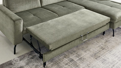 Mit der Querschläfer-Funktion verwandeln Sie die Couch schnell und einfach in ein gemütliches Gästebett für ein bis zwei Personen oder in eine vergrößerte Wohnlandschaft, auf der Sie sich noch besser entfalten und entspannen können. Die Liegefläche ist mit Polyätherschaum auf Federholzleisten gepolstert sowie mit dem olivfarbenen Originalstoff bezogen.