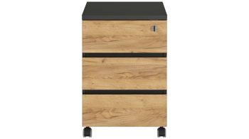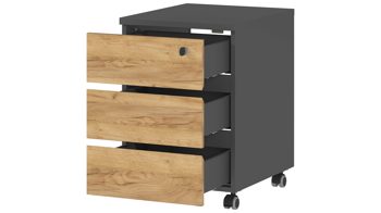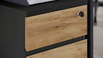 Während der Korpus matt graphitfarben designt ist, präsentieren sich die Fronten der Schübe holzfarben in Navarra-Eiche-Nachbildung. Die gelungene Farbkombination verleiht dem Container eine sehr edle Ausstrahlung mit einladendem Naturcharme.