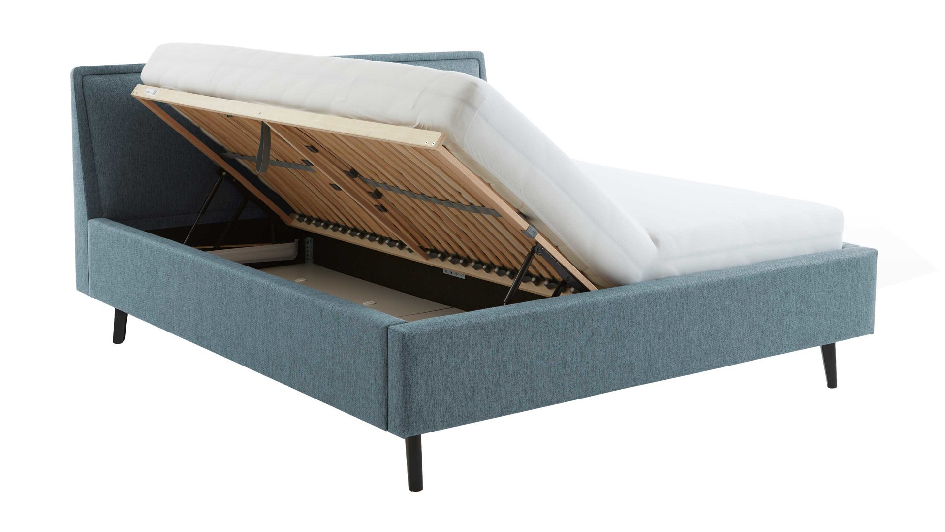 Das Polsterbettgestell Frieda mit Bettkasten verkörpert modernen Komfort. Mit dem oceanfarbenen Stoffbezug und den schwarzen Holzfüßen präsentiert es sich elegant und gemütlich designt. Die Bettseiten sind genauso wie das Polsterkopfteil glatt bezogen. Letzteres ist eine angenehm weiche Rückenlehne, wenn Sie abends im Bett vor dem Schlafen noch entspannt in Ihrem Buch lesen oder fernsehen möchten.