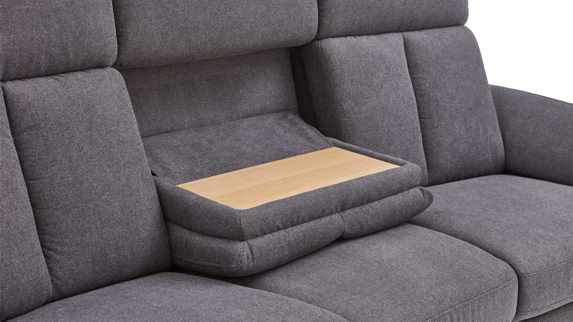 Die Tischfunktion ist ein Funktions-Mehrpreis für die Sofas aus dem hochwertigen Polsterprogramm OrthoSedis 4.0. Um sie anzuwenden, klappen Sie die mittlere Rückenlehne nach vorn. Auf diese Weise legen Sie die als Tisch nutzbare Holzablage in Eiche bianco auf der Rückseite der Lehne frei.
