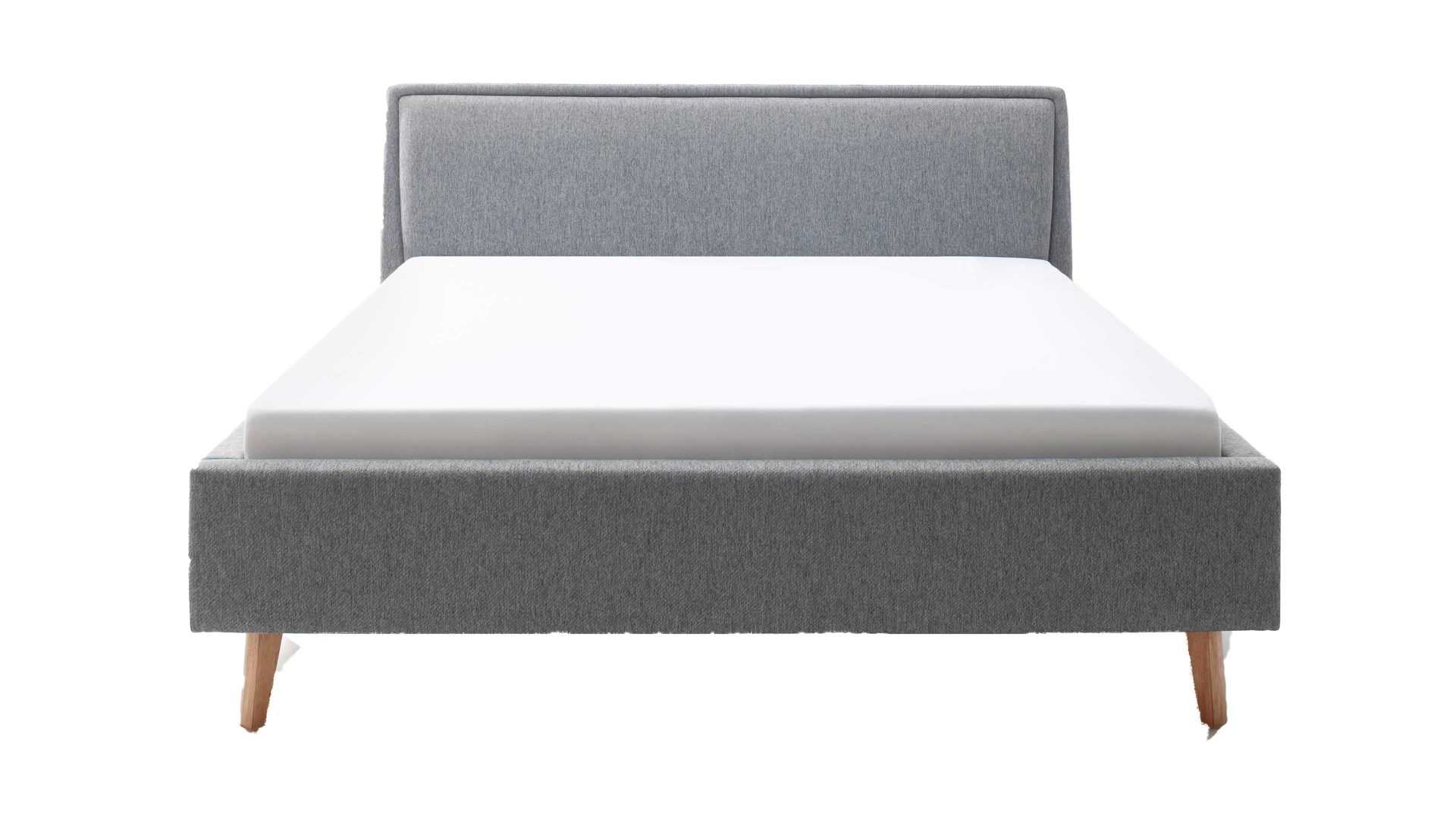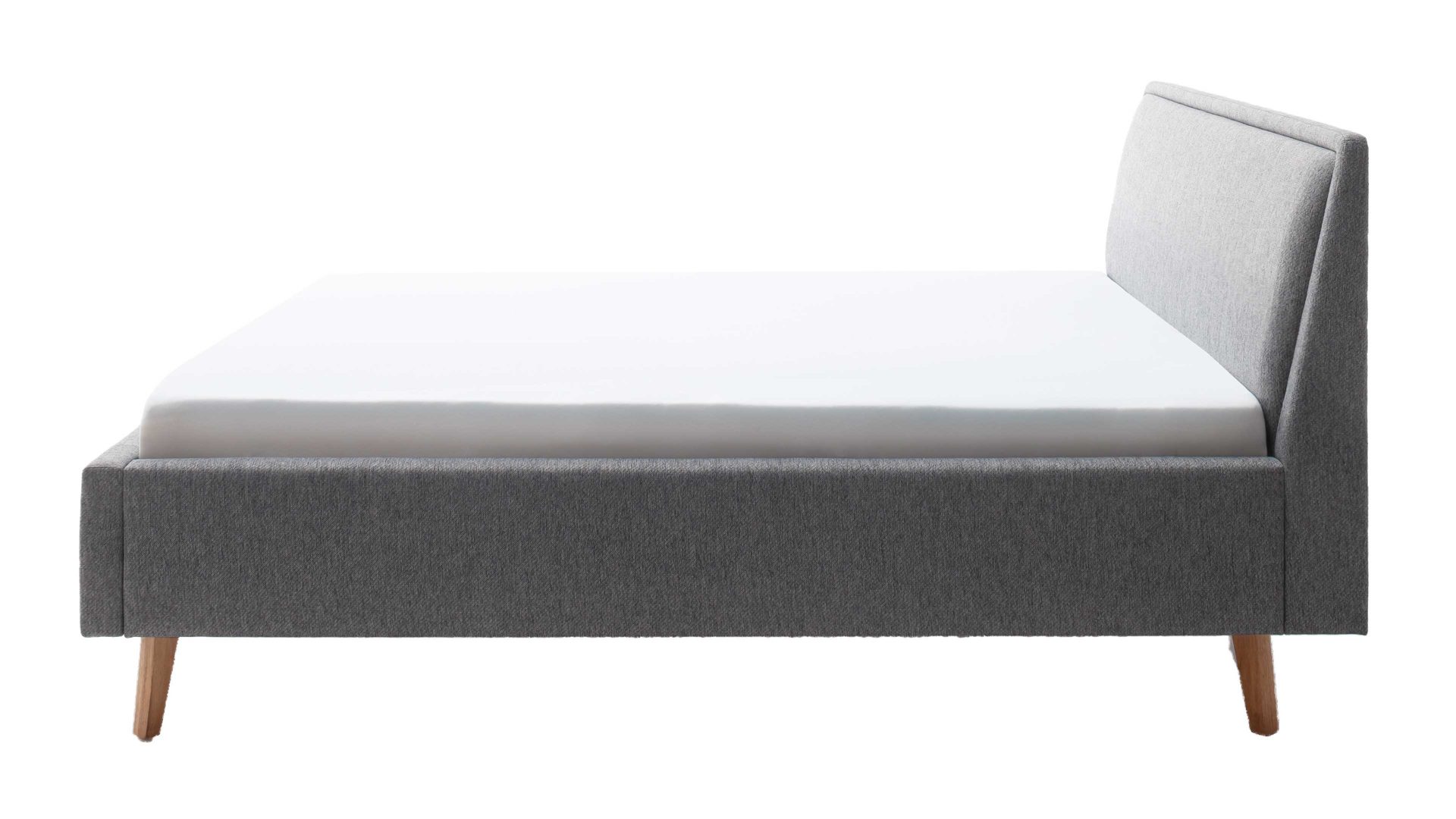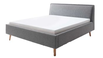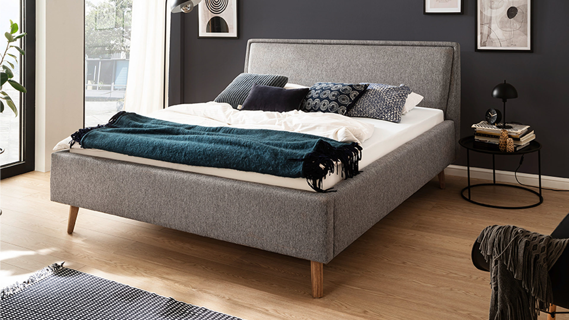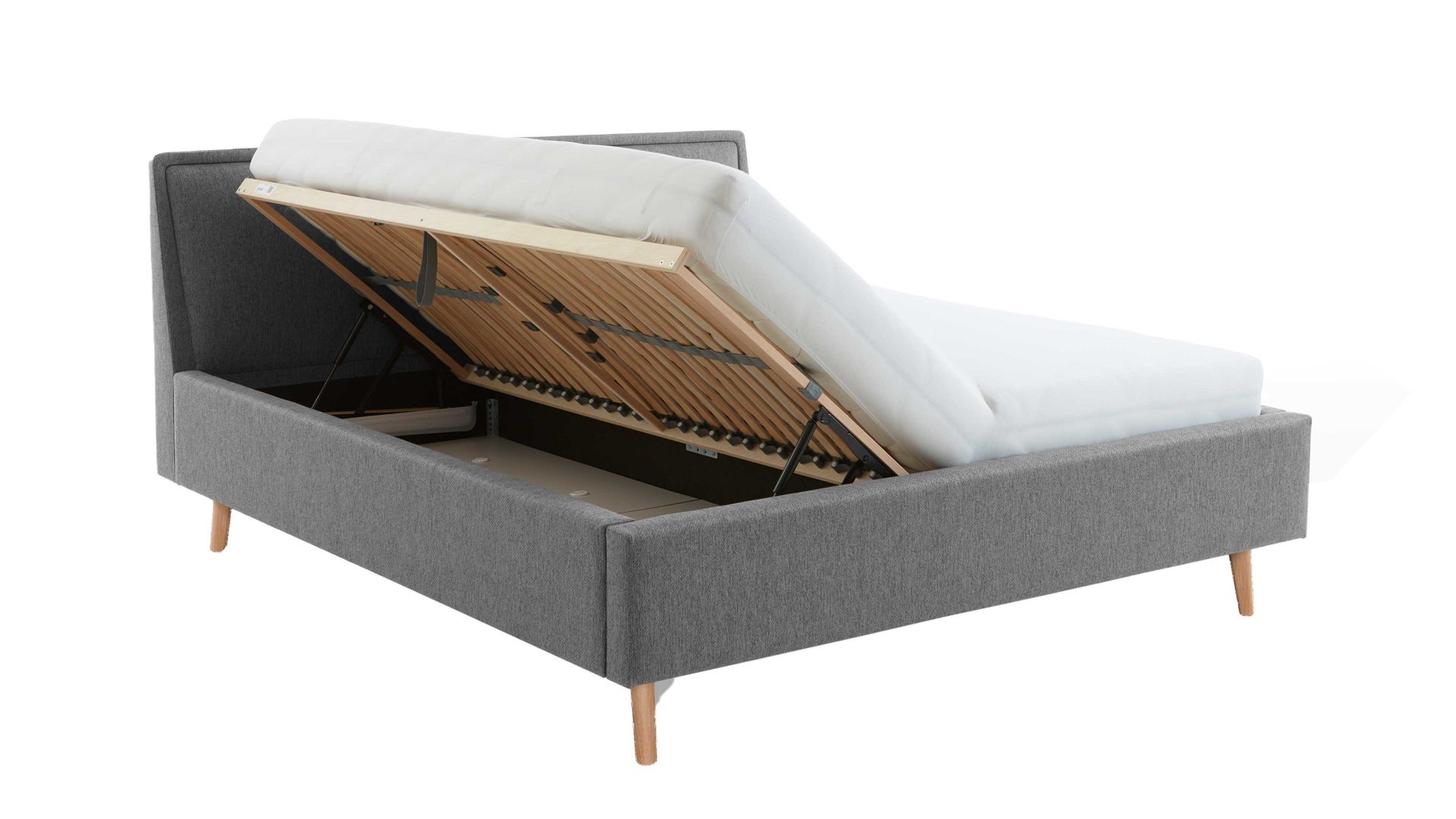 Das Polsterbettgestell Frieda mit Bettkasten verkörpert modernen Komfort. Mit dem grauen Stoffbezug und den eichefarbenen Holzfüßen präsentiert es sich elegant und gemütlich designt. Die Bettseiten sind genauso wie das Polsterkopfteil glatt bezogen. Letzteres ist eine angenehm weiche Rückenlehne, wenn Sie abends im Bett vor dem Schlafen noch entspannt in Ihrem Buch lesen oder fernsehen möchten.