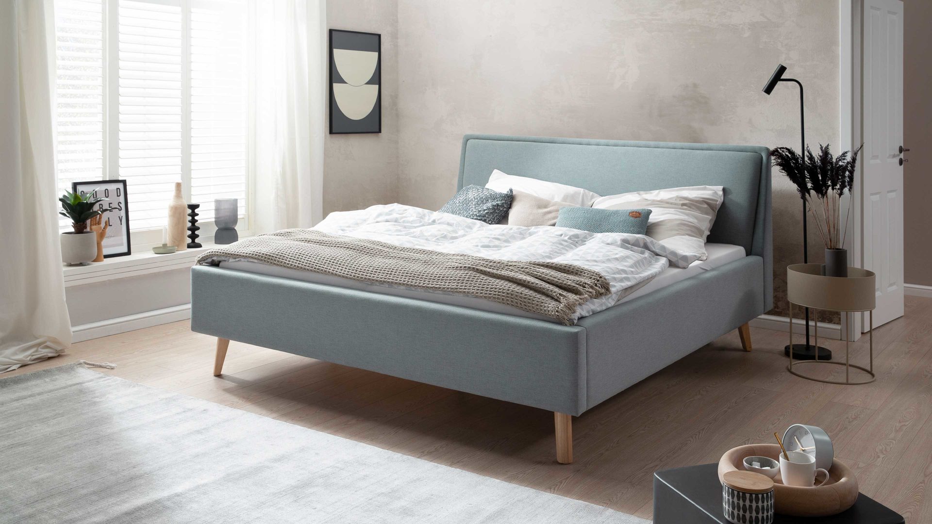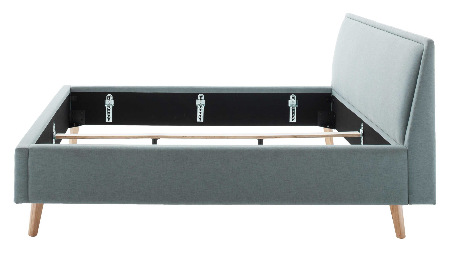 Das Polsterbettgestell Frieda mit Bettkasten verkörpert modernen Komfort. Mit dem eisblauen Stoffbezug und den eichefarbenen Holzfüßen präsentiert es sich elegant und gemütlich designt. Die Bettseiten sind genauso wie das Polsterkopfteil glatt bezogen. Letzteres ist eine angenehm weiche Rückenlehne, wenn Sie abends im Bett vor dem Schlafen noch entspannt in Ihrem Buch lesen oder fernsehen möchten.