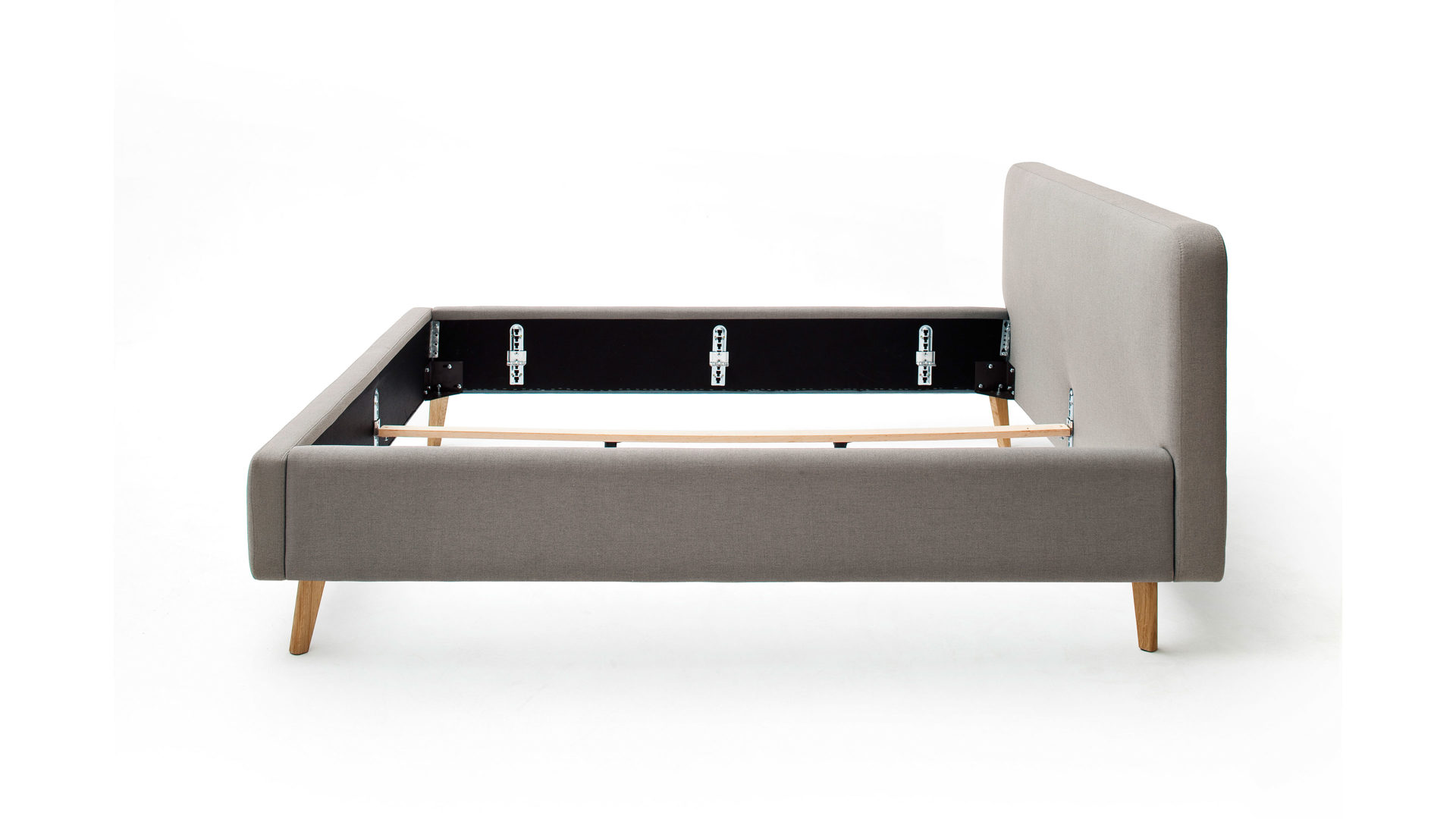 Das Polsterbettgestell Mattis begeistert durch die elegante Optik sowie die hervorragende Material- und Verarbeitungsqualität. Es kombiniert einen taupefarbenen Flachgewebe-Bezug mit eichefarbenen Holzfüßen. Sowohl die Bettseiten als auch das Polsterkopfteil sind glatt bezogen. Letzteres lädt Sie ein, sich anzulehnen, wenn Sie abends im Bett vor dem Schlafen noch fernsehen oder in einem Buch lesen.