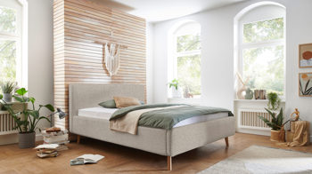 Die warme Farbe der Füße kontrastiert mit dem frischen Ton des Bezugs - und doch harmonieren die beiden Nuancen hervorragend und verführen zu Traumreisen - beziehungsweise Reiseträumen - ans Meer und einen herrlich warmen Sandstrand. Ein weiteres Highlight des rundum überzeugenden Bettgestells bildet das glatt bezogene Polsterkopfteil. Dieses ermöglicht durch die weiche Haptik auch entspannt angelehntes Sitzen, etwa abends beim Lesen vor dem Schlafen oder morgens beim Blick aus dem Fenster zum Wachwerden.