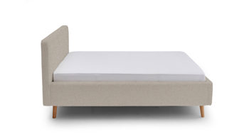 Mit den eichefarbenen Holzfüßen und dem beigefarbenen Boucle-Bezug bringt das Polsterbettgestell Mattis maritimes Flair in Ihr Schlafzimmer.