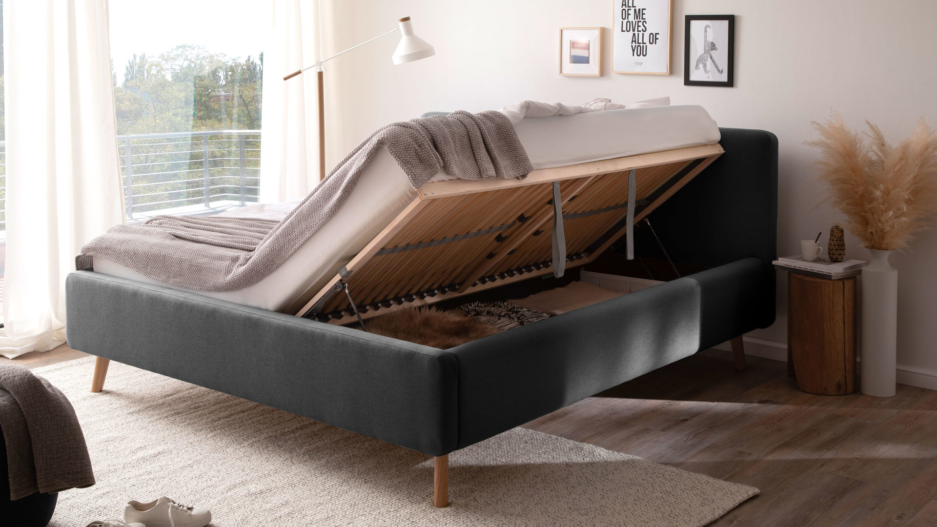 Im Lieferumfang des Bettgestells sind zwei hochwertige Lattenrahmen enthalten, die jeweils 28 Federholzleisten mit Härtegradverstellung aufweisen. Klappen Sie die Lattenrahmen seitlich hoch, um sich Zugang zu den Bettkästen mit Gasdruckdämpfer zu verschaffen. In den geräumigen Kästen können Sie etwa Bettzubehör wie Kissen und Decken sowie viele sonstige Utensilien praktisch platzsparend aufbewahren.