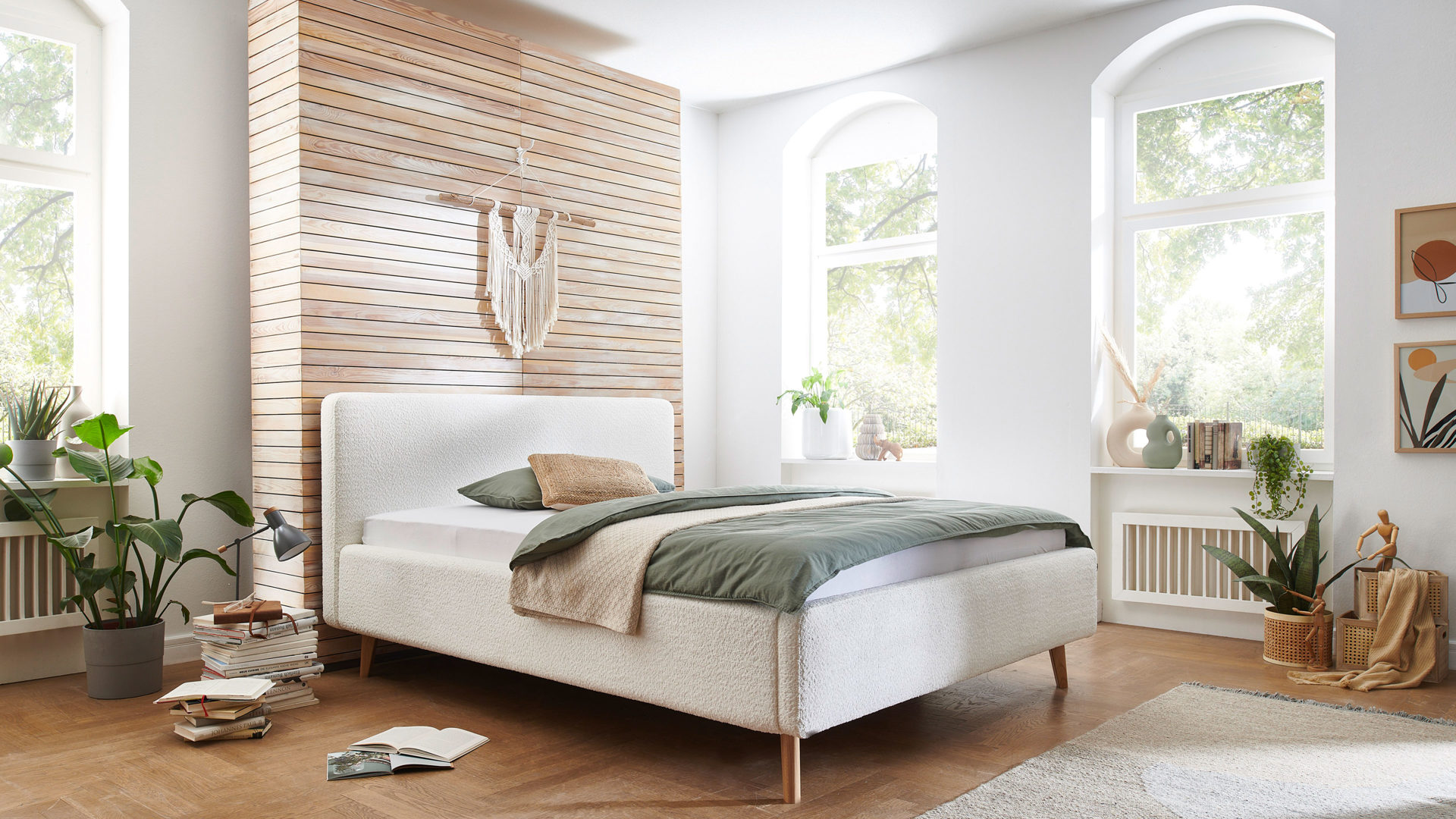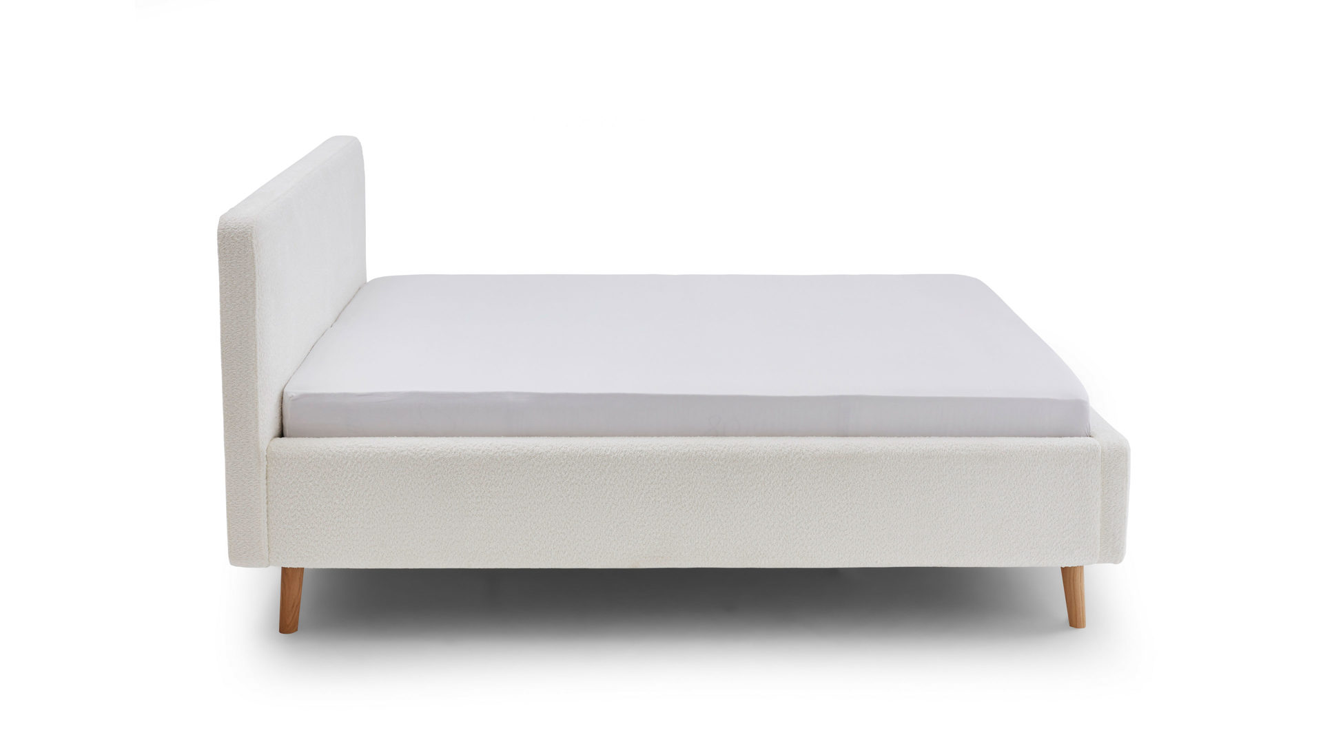 Das Polsterbettgestell Mattis begeistert durch die elegante Optik sowie die hervorragende Material- und Verarbeitungsqualität. Es kombiniert einen weißen Boucle-Bezug mit eichefarbenen Holzfüßen. Sowohl die Bettseiten als auch das Polsterkopfteil sind glatt bezogen. Letzteres lädt Sie ein, sich anzulehnen, wenn Sie abends im Bett vor dem Schlafen noch fernsehen oder in einem Buch lesen.