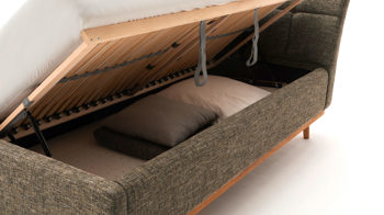 Im Inneren liegen zwei jeweils seitlich zu öffnende Federholzrahmen mit 28 starren Leisten. Dank der möglichen Härtegradverstellung liegen Sie immer genau richtig. Der integrierte Bettkasten ist belüftet und geteilt - für eine Extramaß an Ordnung und Stauraum bei dennoch optimaler Luftzirkulation.