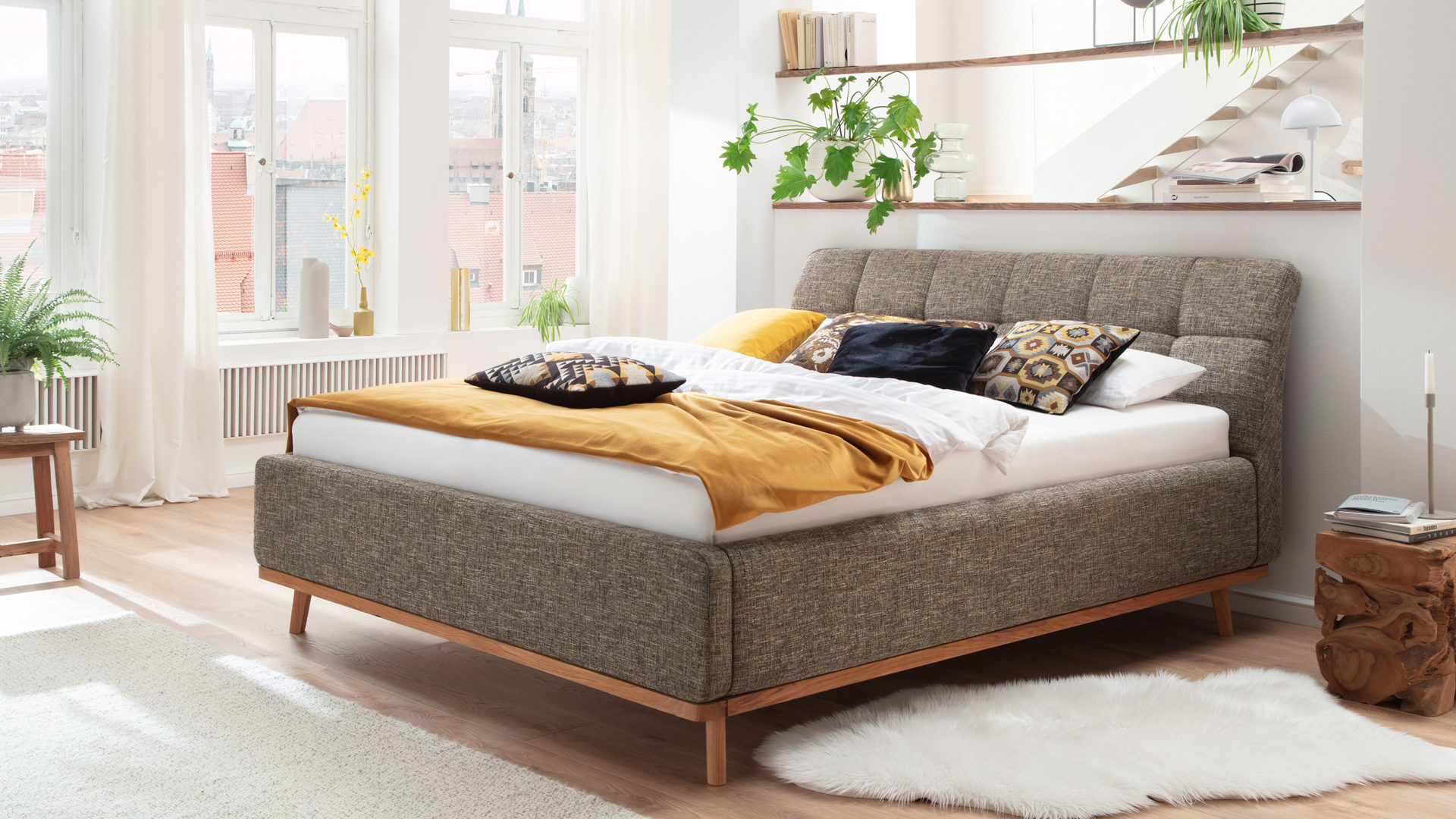 Pure Eleganz bringt das Polsterbettgestell Mila in Ihr Schlafzimmer. Es ruht auf einem eichefarbenen, massiven Holzrahmen. Die ebenfalls eichefarbenen Füße wirken filigran und verleihen diesem Modell eine luftig leichte Ausstrahlung. Ausgestattet ist das schicke Bett mit dem braunen Strukturbezug Building 801.