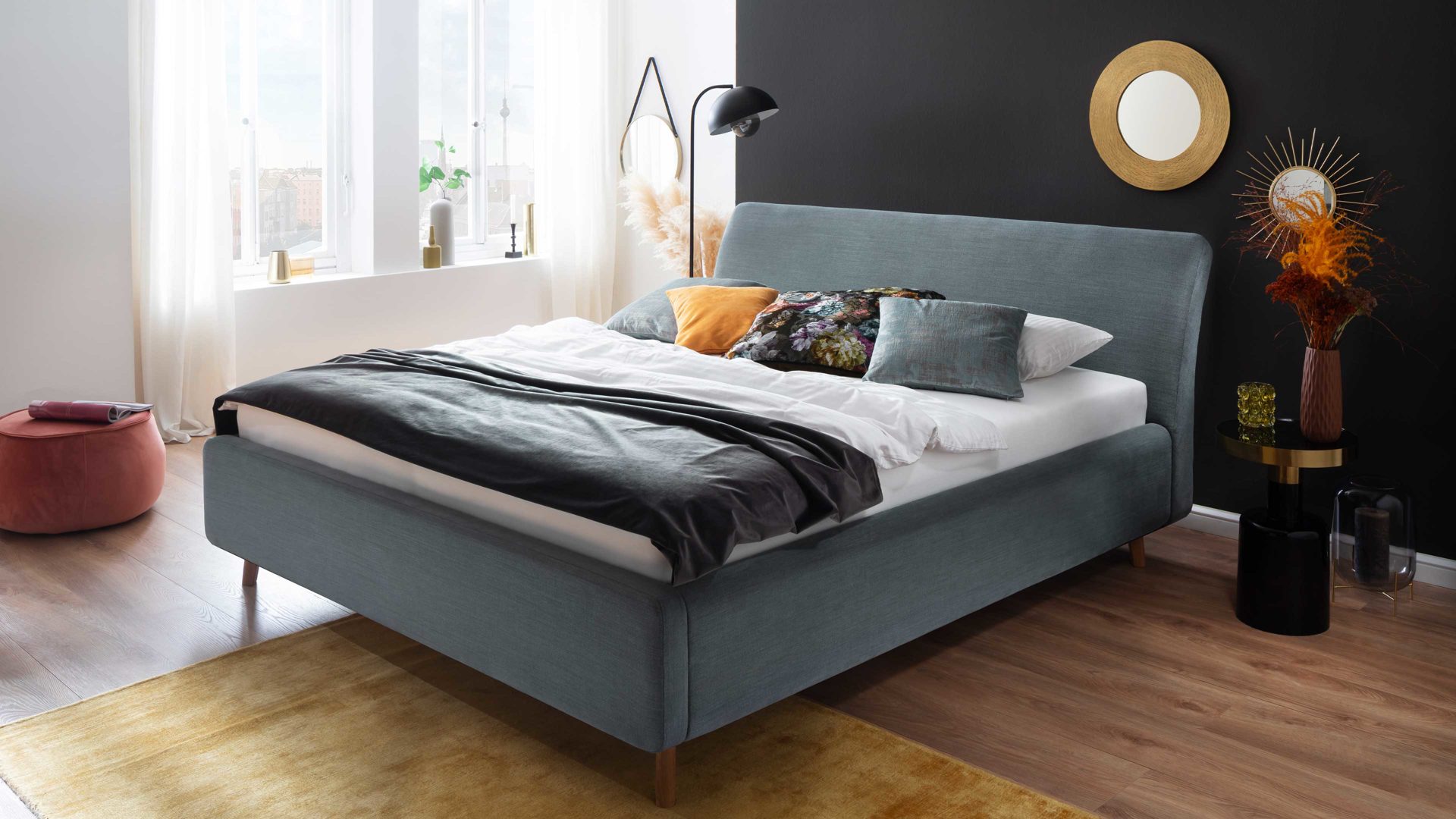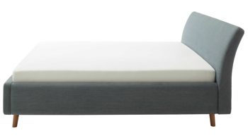 Pure Eleganz bringt das Polsterbettgestell Mila in Ihr Schlafzimmer. Die eichefarbenen Füße wirken filigran und verleihen diesem Modell eine luftig leichte Ausstrahlung. Ausgestattet ist das schicke Bett mit dem Bezug Capri 7463 aus Flachgewebe in der Farbe Ocean.