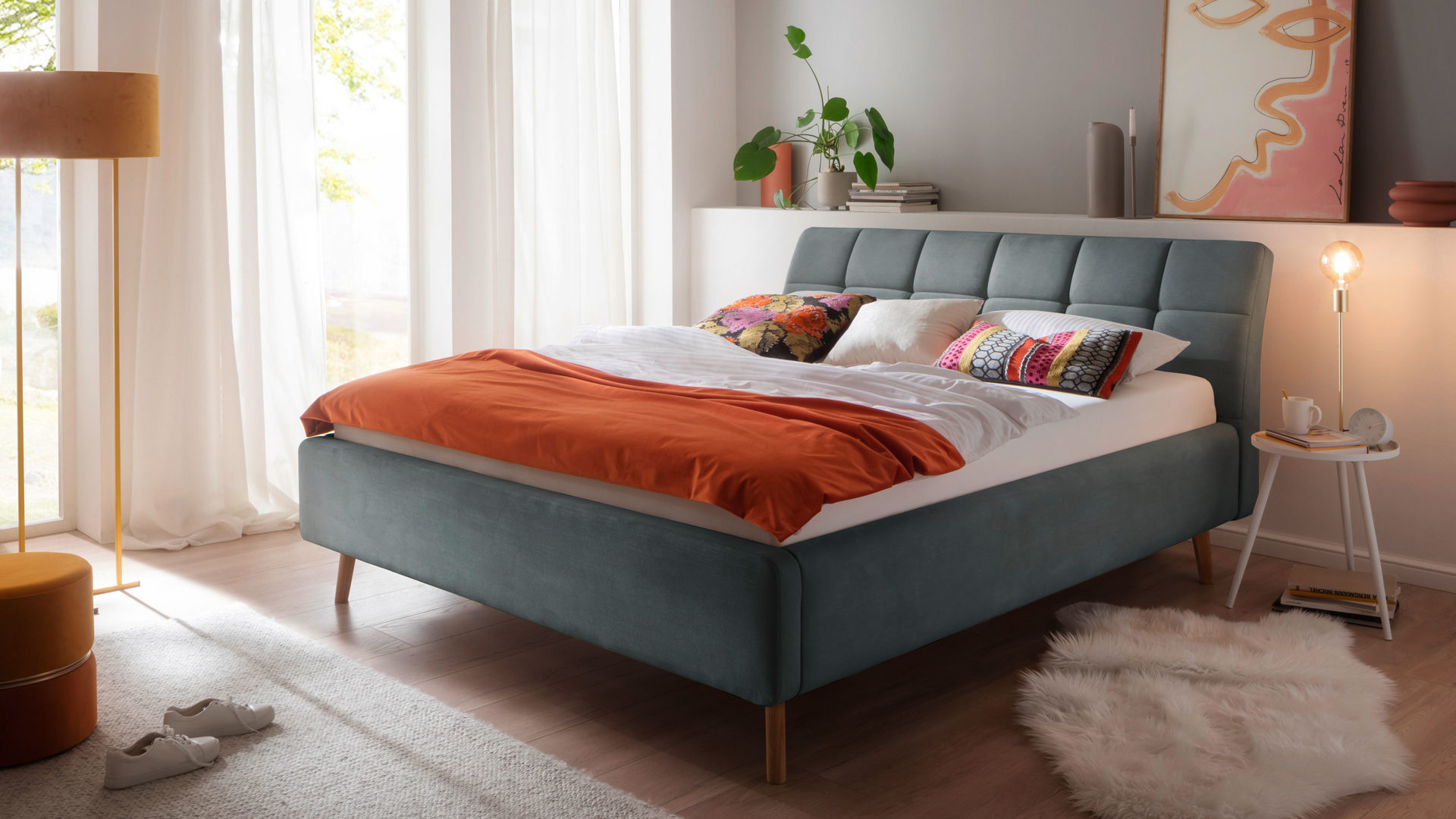 Pure Eleganz bringt das Polsterbettgestell Mila in Ihr Schlafzimmer. Die eichefarbenen Füße wirken filigran und verleihen diesem Modell eine luftig leichte Ausstrahlung. Ausgestattet ist das schicke Bett mit dem Bezug Capri 7463 aus Flachgewebe in der Farbe Ocean.