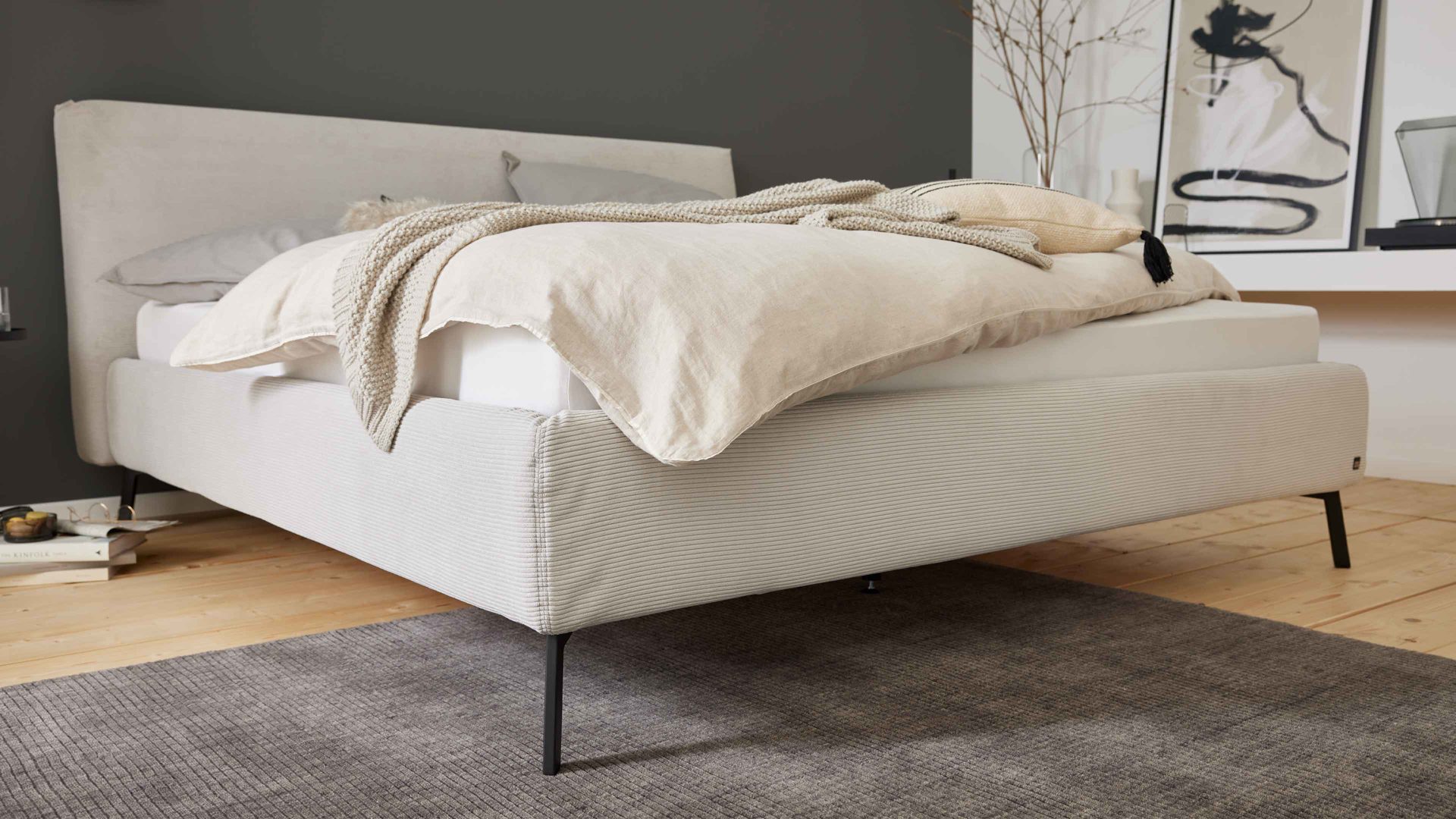 Das Polsterbettgestell aus der Interliving Polsterbett Serie 1417 verbindet modernes Design, erstklassige Materialien und individuelle Planbarkeit zu einer stilvollen Schlaflösung für anspruchsvolle Wohnräume. Der silberfarbene Feincordbezug verleiht dem Bett eine besonders weiche Haptik und eine edle, wohnliche Ausstrahlung, während die mattschwarzen Metallfüße einen markanten, modernen Kontrast setzen.