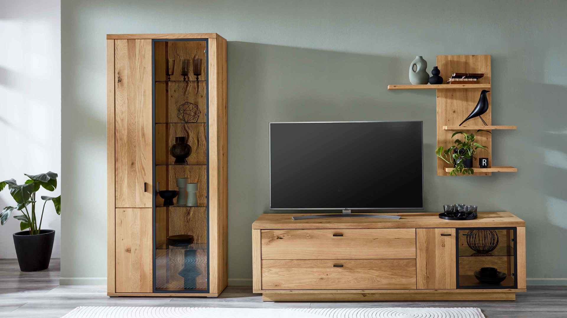 | Farbhinweis: | Eiche Artisan Schwarzgrau sandgestrahltes Holz Klarglas | |
