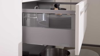 Die zweiteilige Kombination überzeugt mit einer durchdachten Aufteilung und einer klaren Linienführung. Die L-Küche mit einer Stellfläche von ca. 250 x 296 cm (TxB/L, von lins nach rechts) bietet dank übertiefer Arbeitsplatten besonders viel Platz für die Zubereitung und Organisation im Küchenalltag.